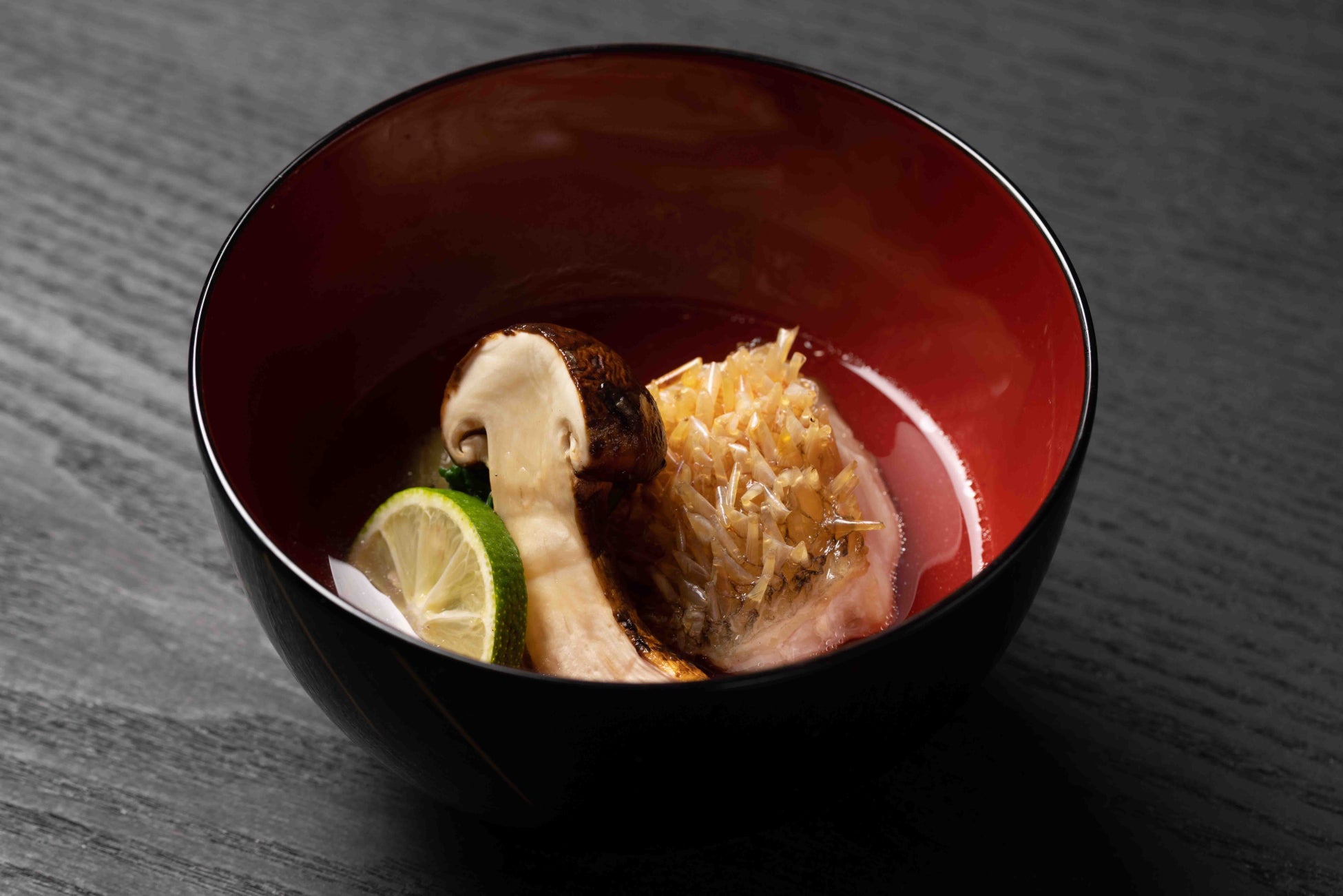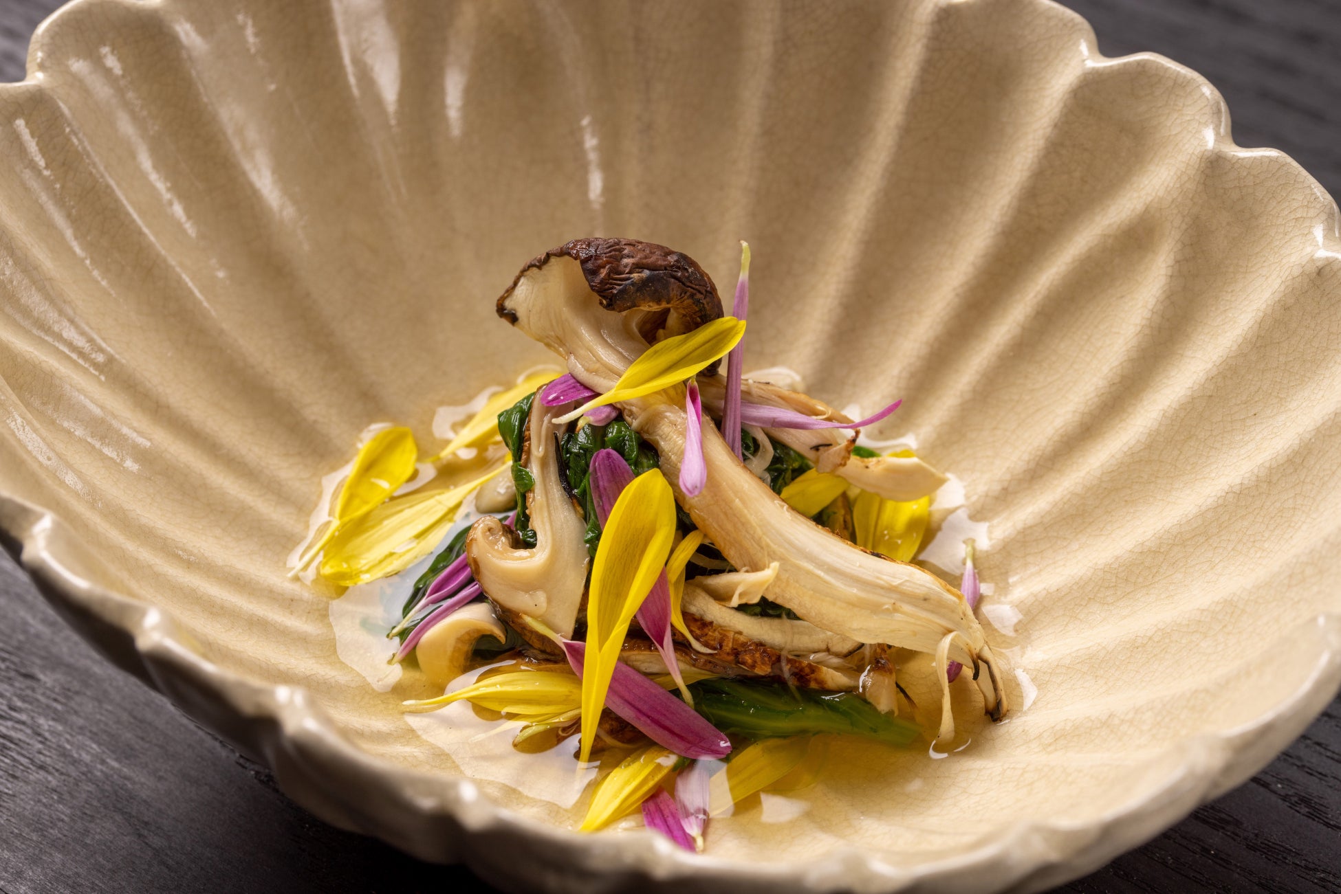 まずは、素材の違いを感じられるよう、炭火でさっと炙り、手で割いたばかりの松茸を、菊花で香りと彩りを添えて提供します。曇りのない味わいとしっかりとした松茸の歯ごたえを堪能できます。