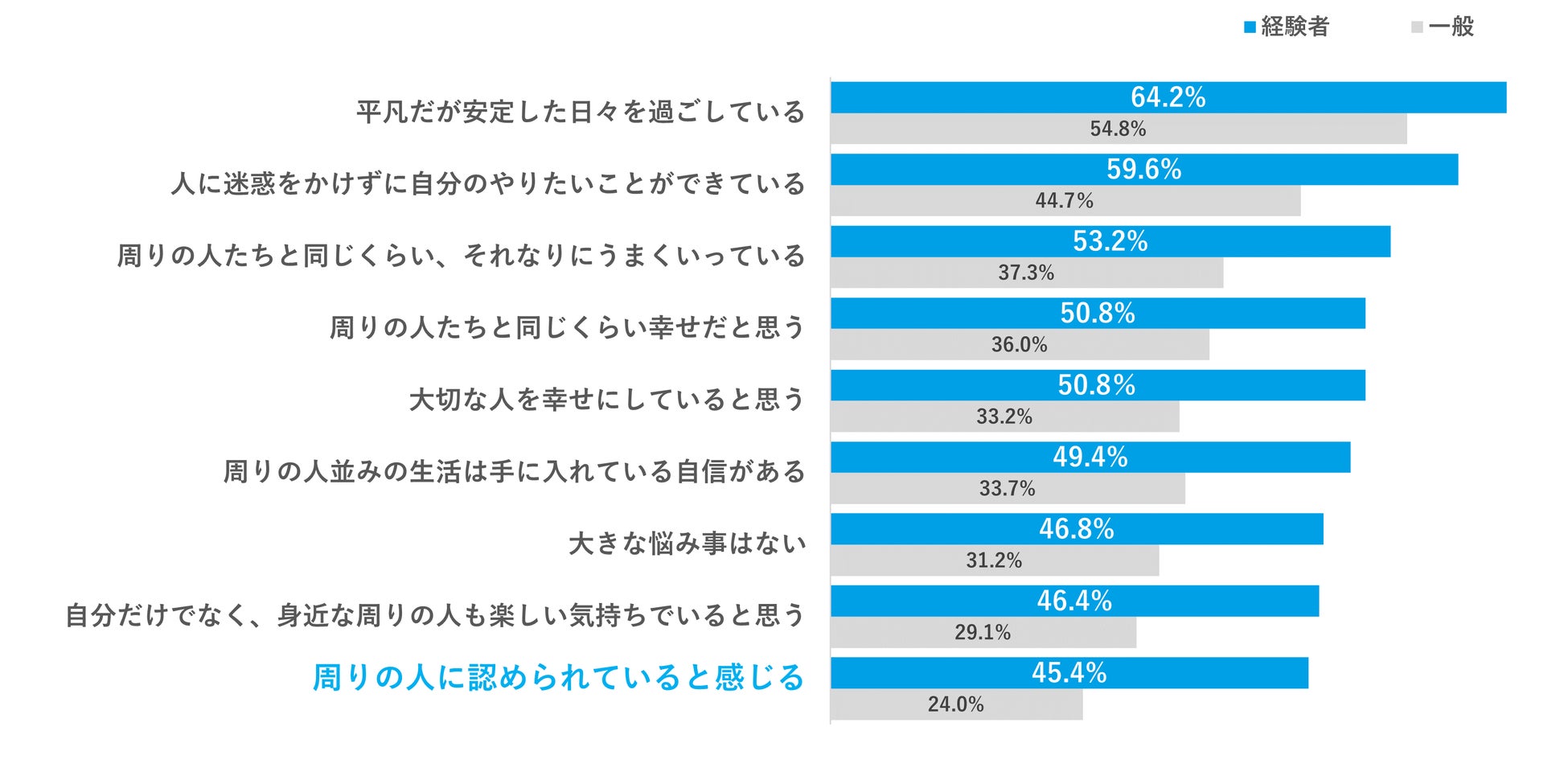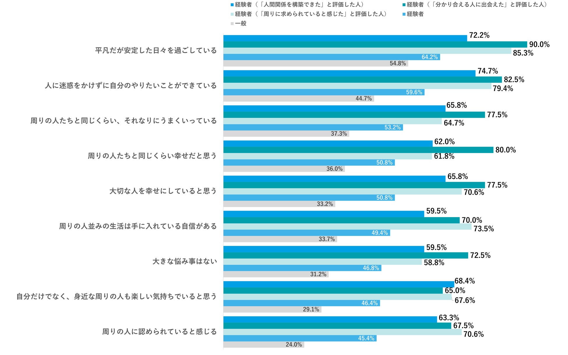 次に、暮らし方に関する意見と、自分自身や人との関り方について質問したところ、リゾートバイトの経験者が全項目で一般生活者よりもスコアが高く、ウェルビーイング意識が高いことがわかりました。特に「周りの人に認められていると感じている(45.4%)」については、一般生活者との差分が大きく、幸福感につながっている可能性が高いと言えそうです。(図3)リゾートバイトの経験を「周りに認められていると感じた」「分かり合える人に出会えた」「人間関係を構築できた」と評価している人の幸福度は一般生活者に比べ、経験者の中でも、突出して高いことから、リゾートバイトはその後の生き方や姿勢にプラスに働くことがうかがえます。(図4)