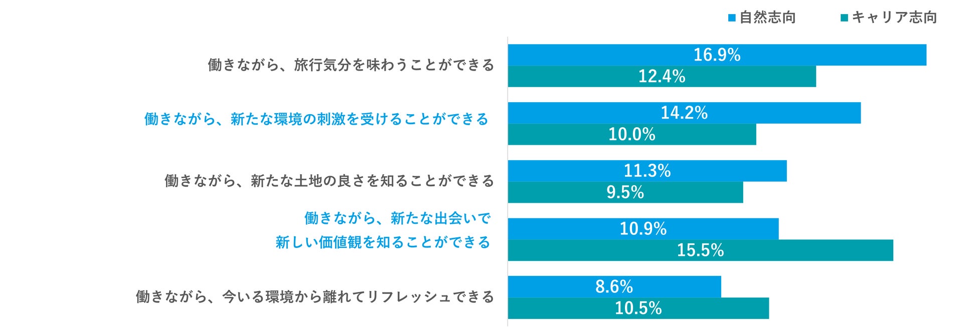 一般生活者のリゾートバイト仮説ベネフィット評価として、キャリア志向層は新しい出会いと新しい価値観を得ることに対して評価しているのに対して、自然志向層は新しい環境からの「刺激」を評価しています。(図5)