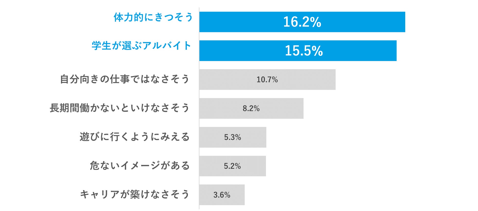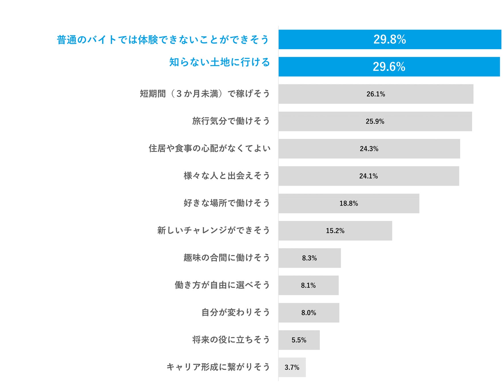 とくに「普段できない経験ができた(27.8%)」「普通のバイトよりも面白かった(27.8%)」「様々な人と出会えた(27.4%)」「知らない土地に行けた(26.2%)」がいずれも3割弱で上位となりました。(図2)