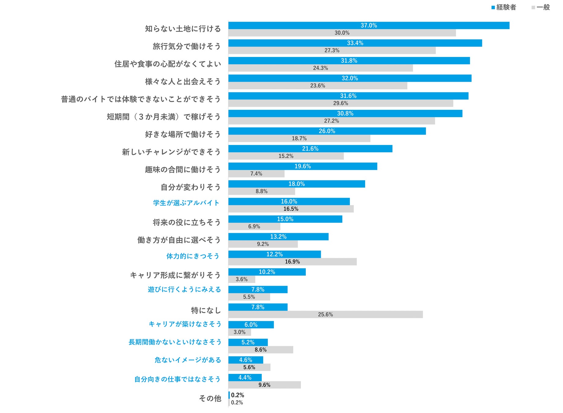 15~69歳の男女20,000人に「リゾートバイト」と聞くとどのような働き方の印象を持つかを調査したところ、ポジティブイメージが約67%を占めていました。ポジティブなイメージでは「普通のバイトでは体験できないことができそう」「知らない土地に行ける」が約3割で上位を占めています。(図1-1)ネガティブなイメージでは「体力的にキツそう」「学生が選ぶバイト」という回答が上位となりました。(図1-2)全体傾向として、リゾートバイトの印象は経験者の中では、ポジティブな評価が多く、反対にネガティブな印象は経験者よりも一般生活者内で高い傾向が見られます。(図1-3)