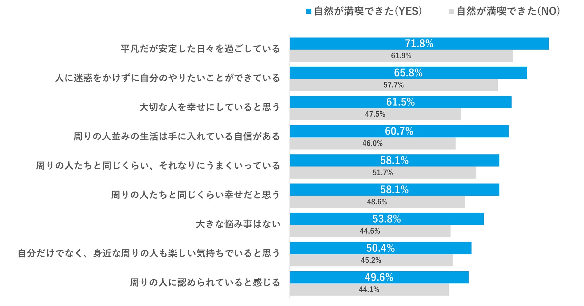 一般生活者よりはもちろんのこと、リゾートバイトの経験者全体の平均値よりも、ウェルビーイング意識が高い傾向にあります。このような背景から、自然に触れ合うことでウェルビーイング意識が高まると言えそうです。(図6)