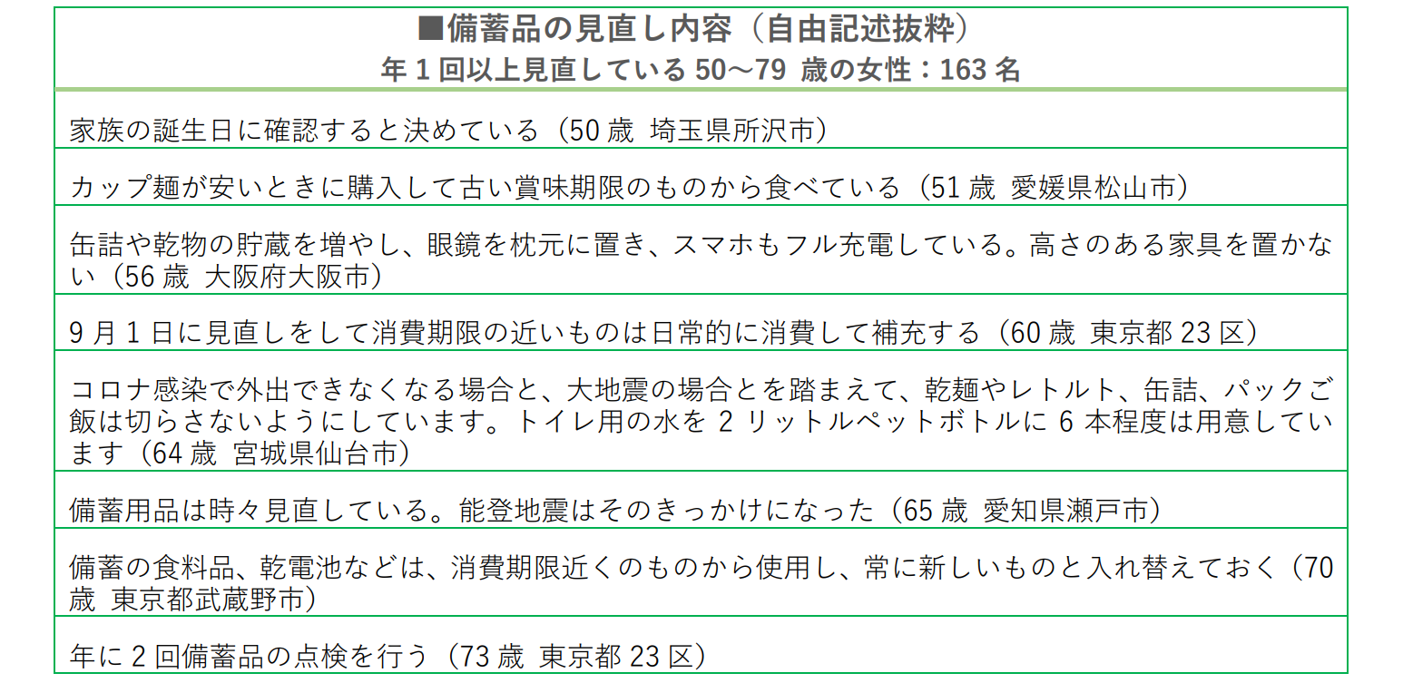 ■備蓄品の見直し内容(自由記述抜粋) 年1回以上見直している50~79 歳の女性:163名 |