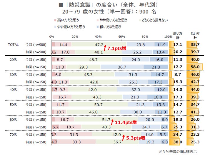 防災意識の度合いについて「高い方 計(「高い方だと思う」+「やや高い方だと思う」)」の割合は17.1%。前回調査と比べて約3ポイント低下している。「低い方 計(やや低い方だと思う+低いほうだと思う)」の割合は35.7%。こちらも前回と比べて約4ポイント低下。