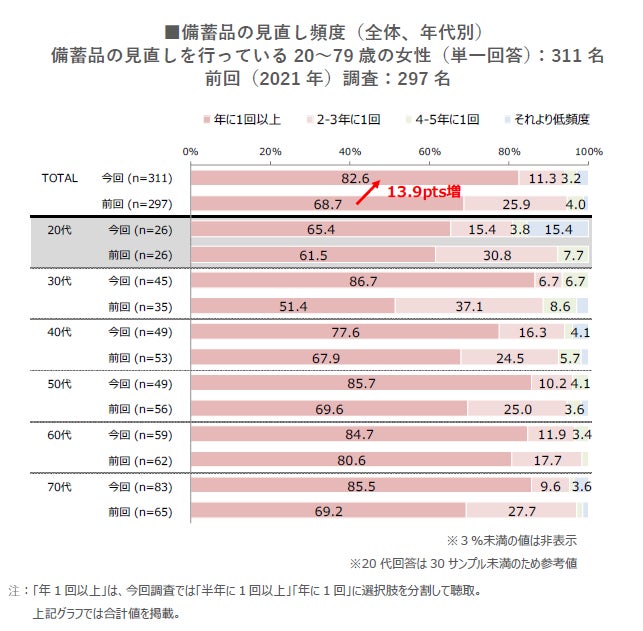 備蓄品の見直しを行っている人の見直し頻度は、2021年よりも増えており、「年に1回以上」が全体で約14ポイント増。50代以上は85%前後が「年に1回以上」行っている。