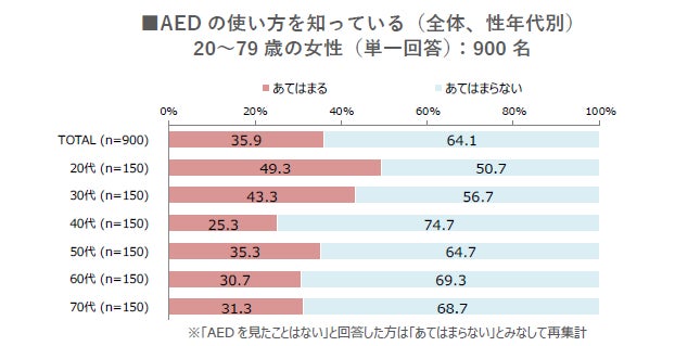 他方、「AEDの使い方を知っている」割合は、20代30代に比べて、50代以上は低くなっている。