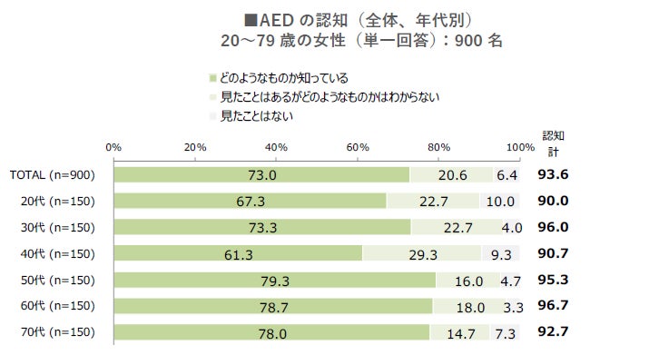 AEDの内容認知率は50代以上で高い一方、使い方の認知率は30代以下に比べて低い