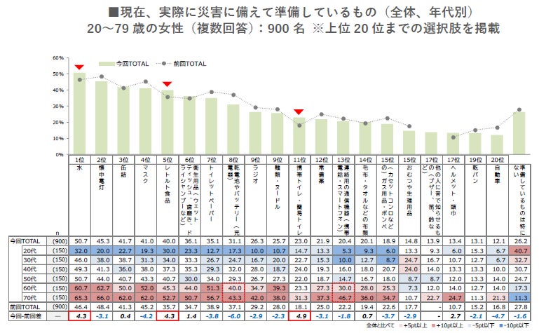 そのほか「携帯トイレ・簡易トイレ」も約5ポイント上昇している。「乾電池やバッテリー(充電器)」「連絡用の通信機器」といった、デジタルまわりの防災グッズの備えは60-70代で高い。