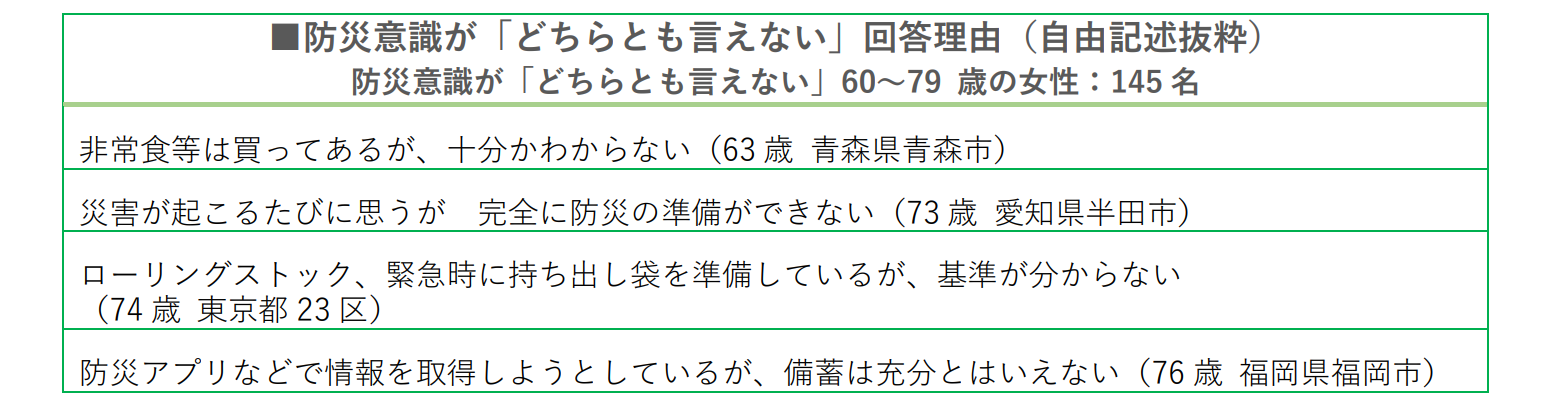 ■防災意識が「どちらとも言えない」回答理由(自由記述抜粋) 防災意識が「どちらとも言えない」60~79 歳の女性:145名 |