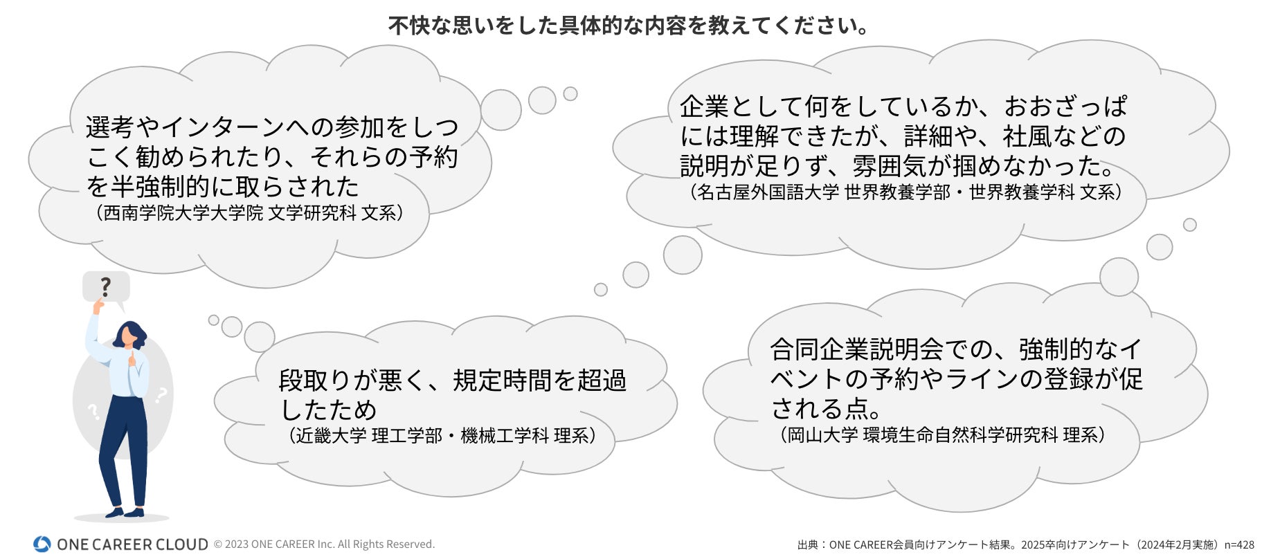「企業説明会であった不快な思い」について回答を求めたところ、以下のようなコメントが集まりました。企業理解を目的として参加している学生にとっては、「選考やインターンなどへの強い勧誘」「内容が薄い」といった印象を抱くことで不快に感じることがわかりました。