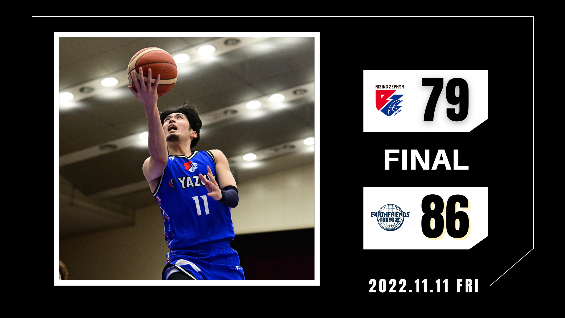 2022年11月11日(金)に開催されましたBリーグ第7節【ライジングゼファーフクオカvs.アースフレンズ東京Z】において“福岡79-86東京Z”の結果となりましたことお知らせいたします。