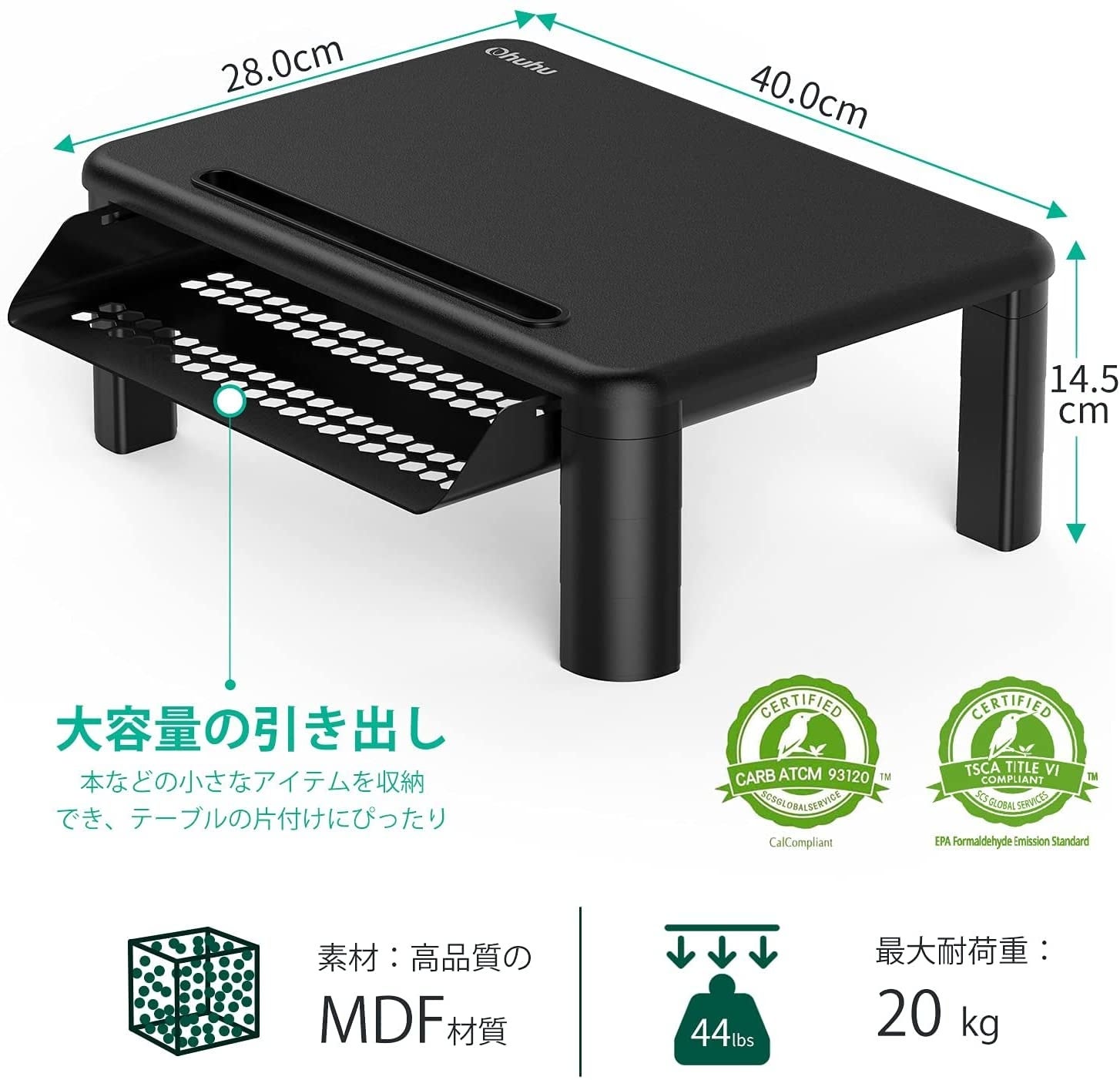 本製品は[Carbフェーズ2&EPA TSCA認定]プレミアムMDF素材を採用しています。耐荷重最大20kgで、頑丈かつ優れた安定性を兼ね備えました。テーブルとの接地面にはゴムパッドを採用し、滑り止め効果や接地面の傷を防ぎます。モニタースタンドに留まらず、プリンター台やデスクオーガナイザーとしても活躍。さらに本製品は2台セットで価格が3千円台と、コストパフォーマンスも高い商品です。場所を選ばす、アイデア次第で活躍の幅も広がります。作業環境も自分らしくアップグレード!日常の快適さを手に入れてみては?