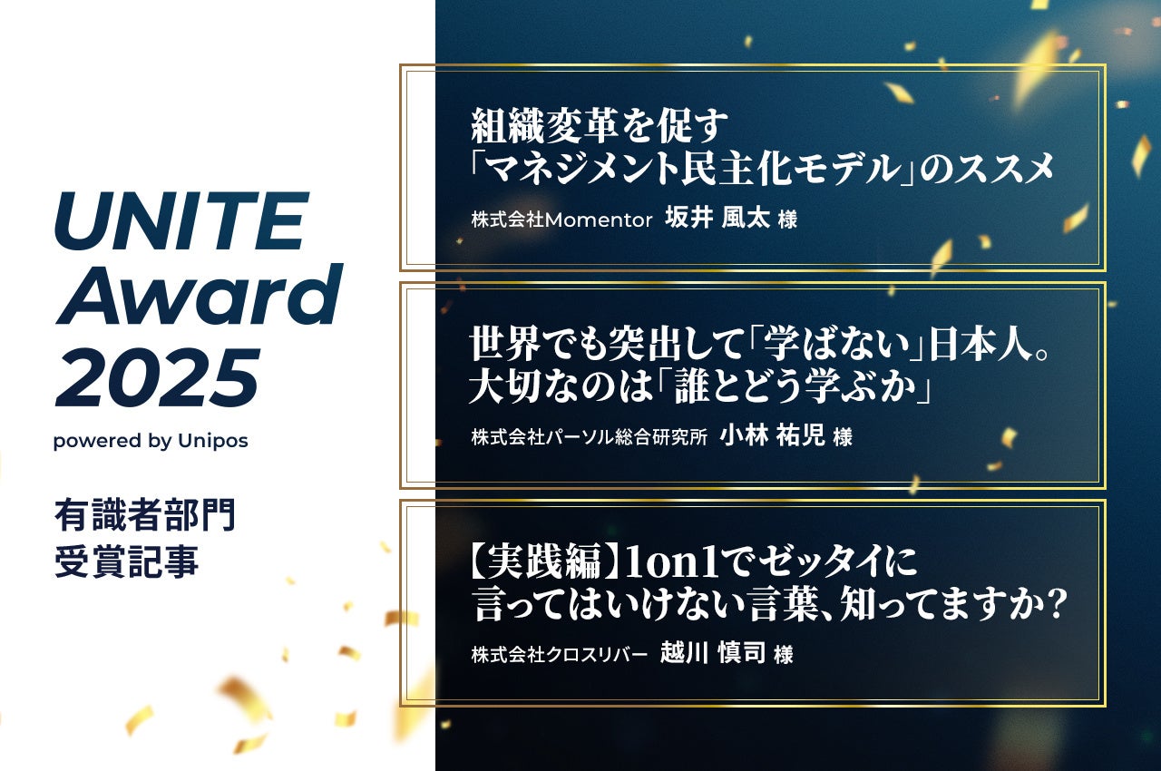 人と組織の力を引き出し組織課題を解決する Unipos株式会社(所在:東京都港区) は、運営するビジネスメディア「UNITE powered by Unipos」の掲載記事の中から、読者に気づきと勇気を与えた記事を表彰する「UNITE Award 2025 powered by Unipos」を実施いたしました。