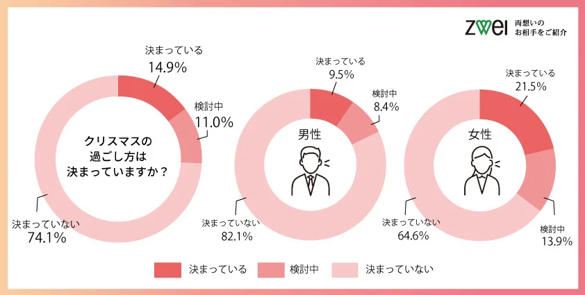 調査内での「クリスマスの過ごし方は決まっていますか」という問いに関して、決まっていない男女は74.1%。何かしら予定を入れる女性に対してギリギリまで予定が決まっていないという男性は多いようです。