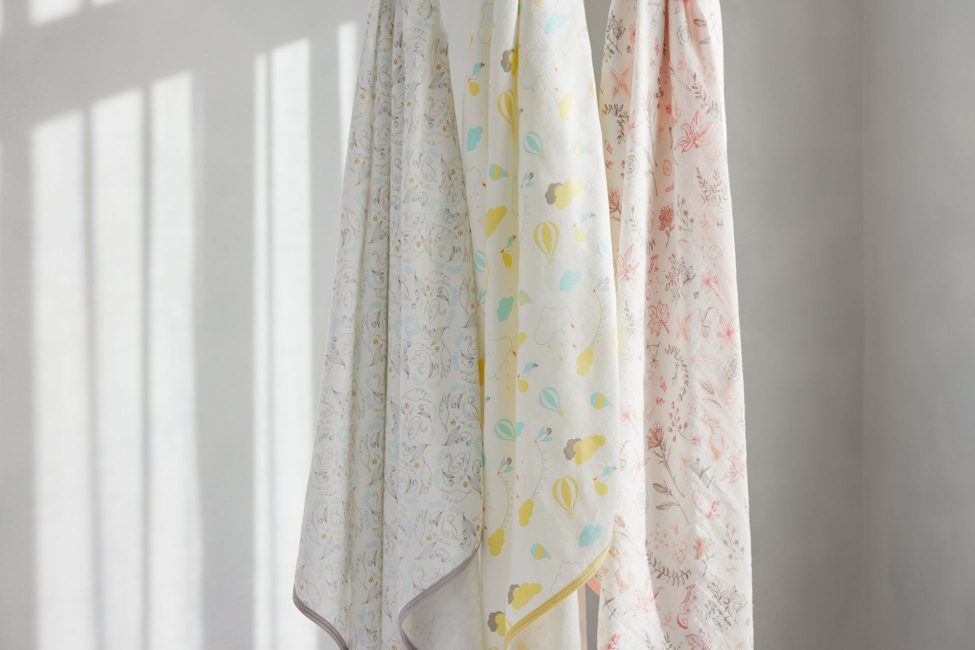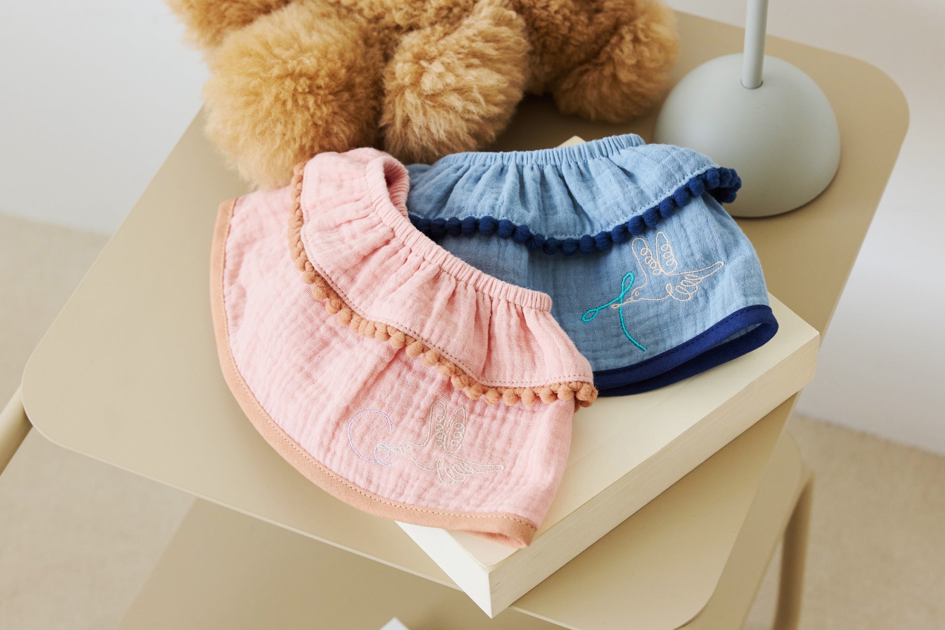 おくるみとスタイに施された縁取り(パイピング)が、繰り返し洗うことでシワになりやすいガーゼの特質をカバー。使いはじめたときのハリ感が続きます。
