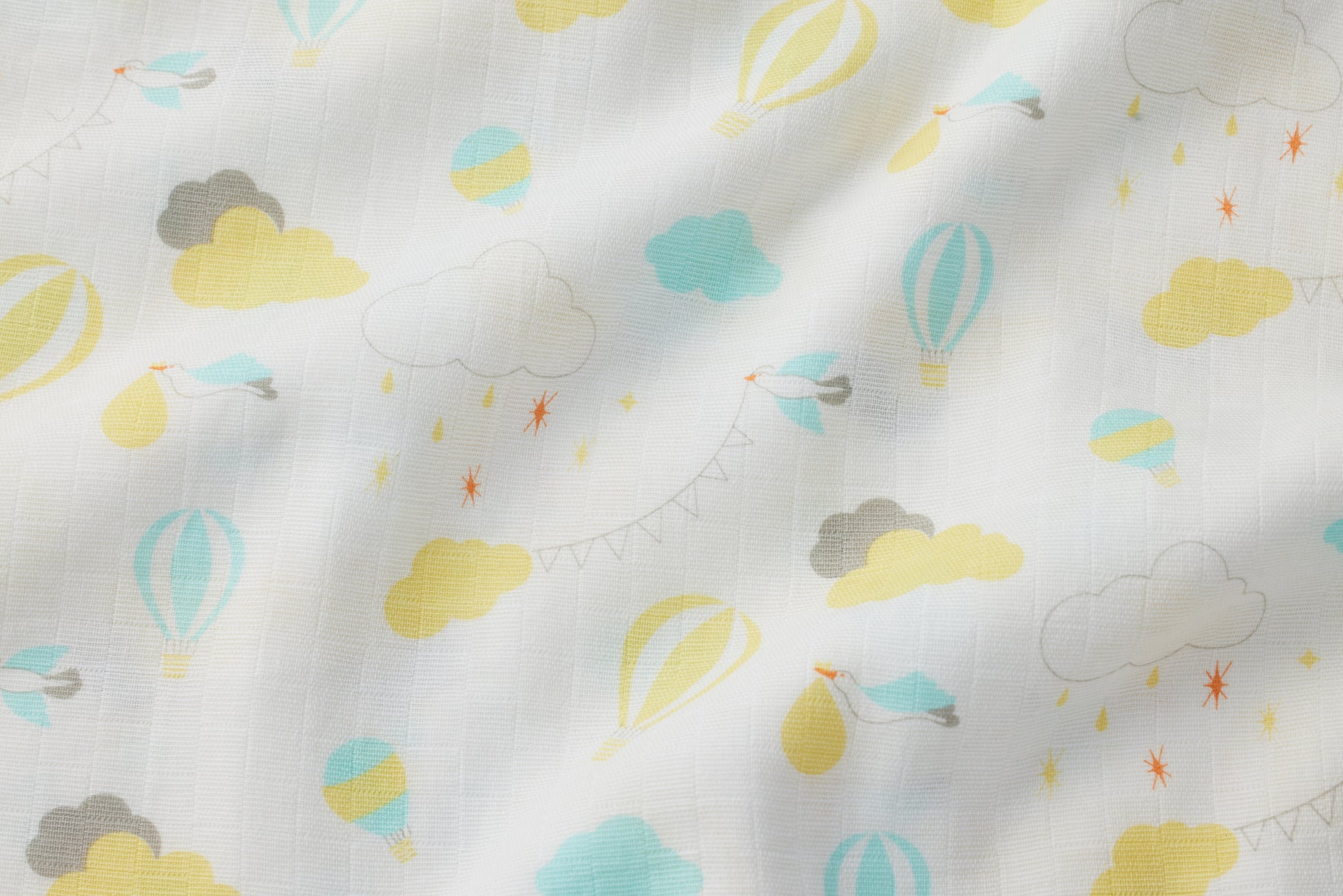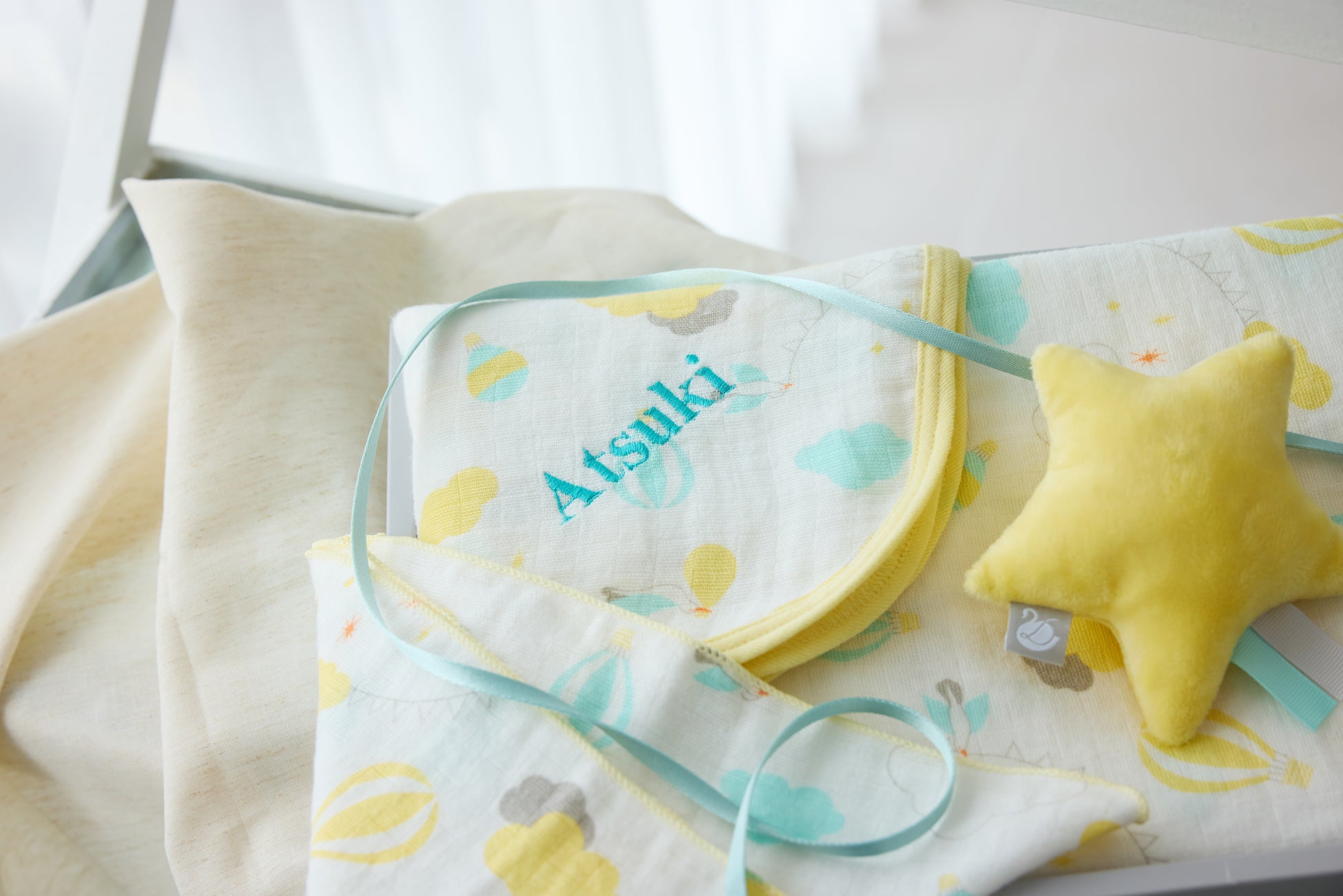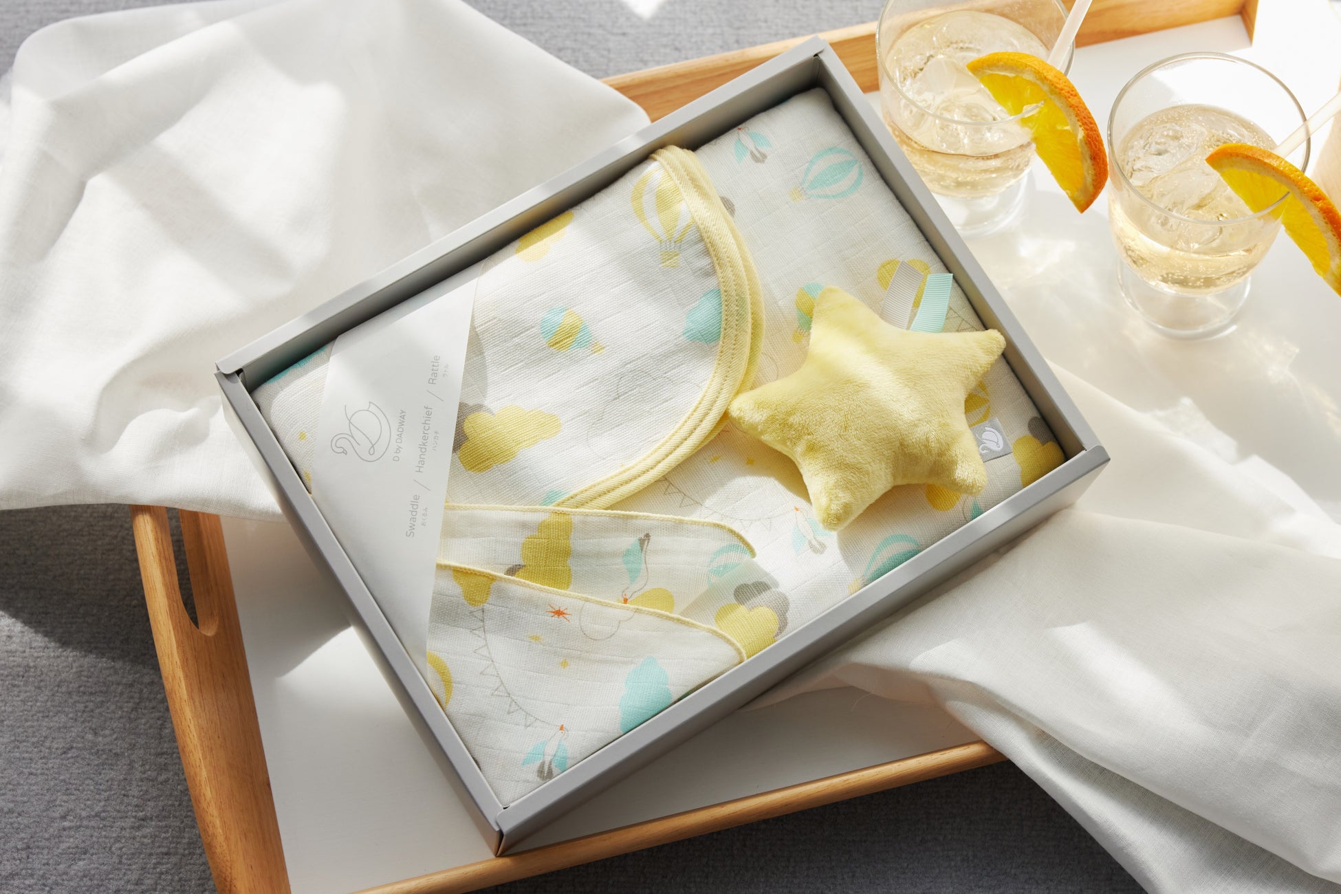 新テキスタイルの“サニーデイ”には柄に合わせたイエロー地に、ミントとグレーのリボンをポイントにしたスターラトルを合わせました。華やかなテイストがお好きな方にも贈りやすいセットです。