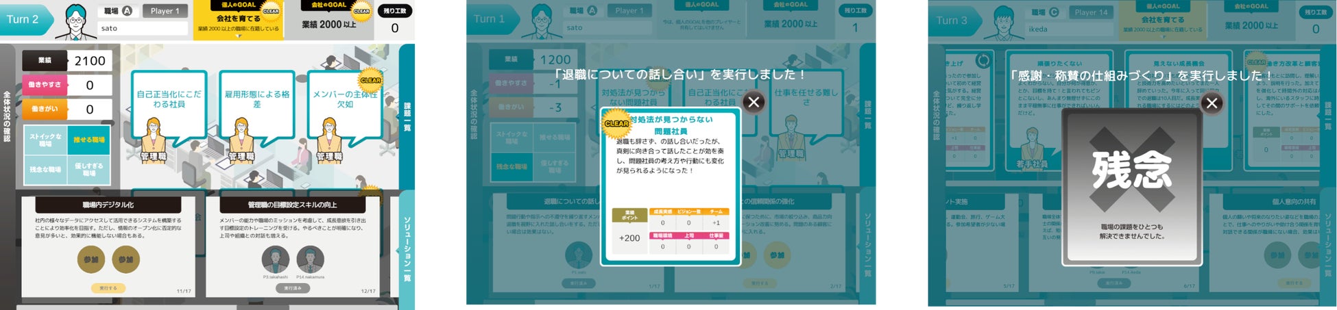 このゲームでは、各プレイヤーが心に抱く”理想の職場”と、”組織全体の成長”、この両方を達成するために、日々の業務で直面する様々な課題をゲーム内で解決していきます。