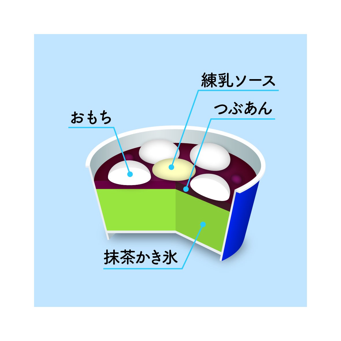 やわもちの特徴である冷凍下でもやわらかいおもちを贅沢に5つのせています。 - 抹茶氷と相性抜群な、つぶあん×練乳ソースの“和風”トッピング