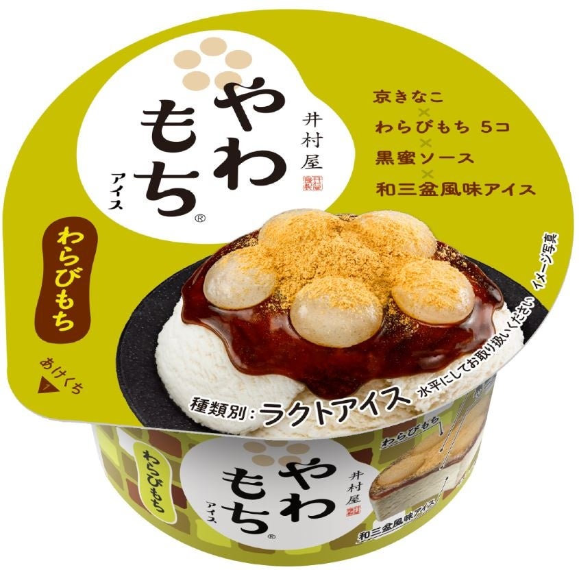 優しい味わいの和三盆風味アイスに、黒蜜ソース、ぷるるん食感のわらびもちを5つのせ、香ばしい京きなこをトッピングしたカップアイスです。