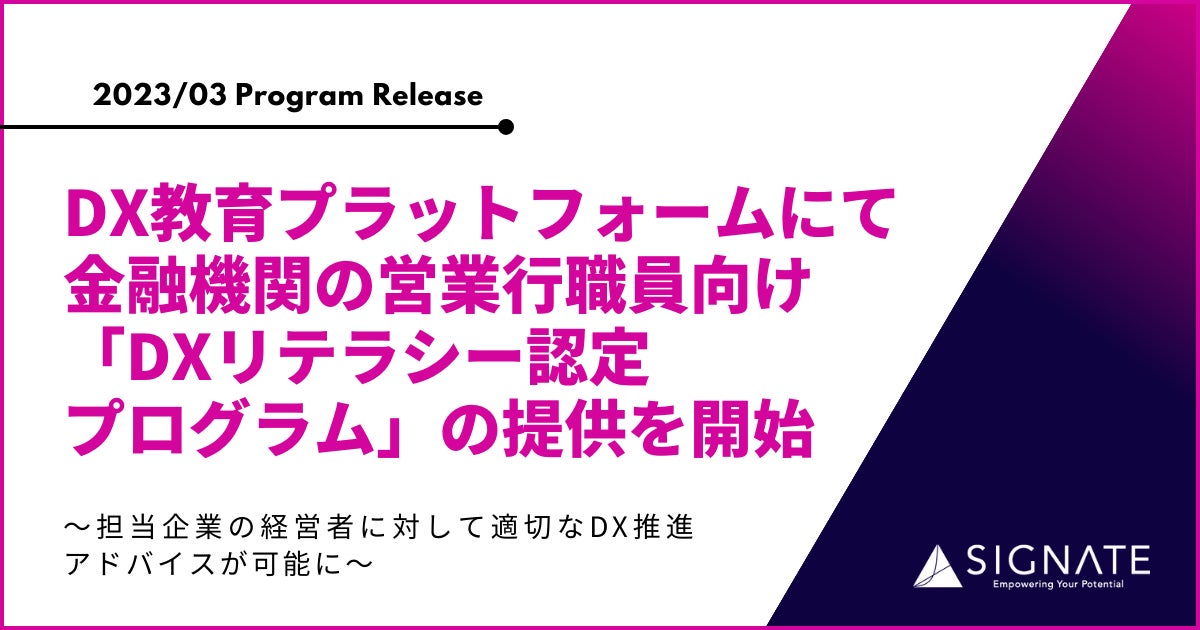 SIGNATE、DX教育プラットフォームにて金融機関の営業行職員向け『DXリテラシー認定プログラム』の提供を開始