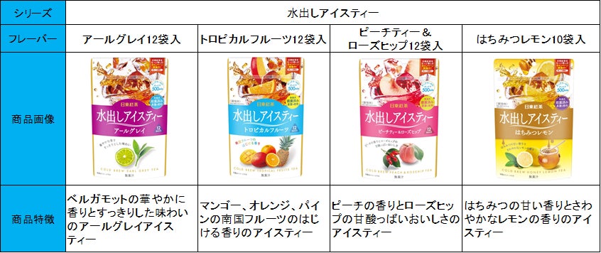 日東紅茶水出しアイスティーシリーズは新商品の「マスカットグリーンティー」の他に、「アールグレイ」、「トロピカルフルーツ」、「ピーチティー&ローズヒップ」、「はちみつレモン」をラインナップ。