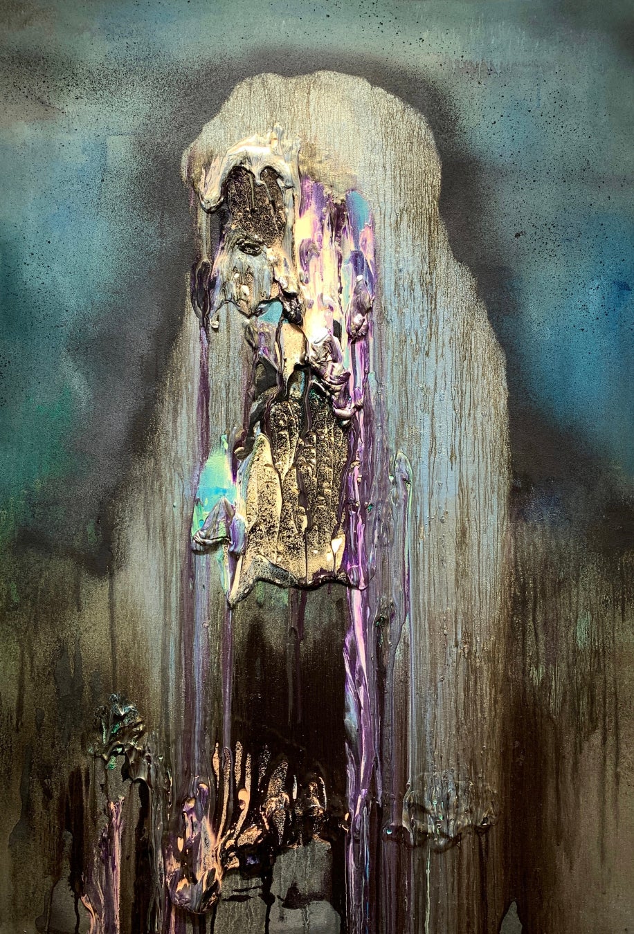 何かしらの物質から剥がされてできた偶発的な絵具の模様は絵画内では存在できる。絵画内の色彩の中でできた物質感はもう戻らない。もとの状態に戻ることができない不可逆性が、絵画の画面内や展示される空間の中に固定される様が死滅回遊魚を想起させた。