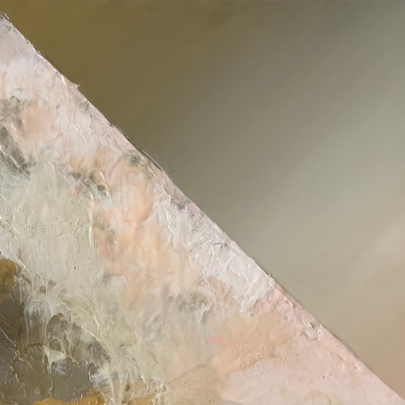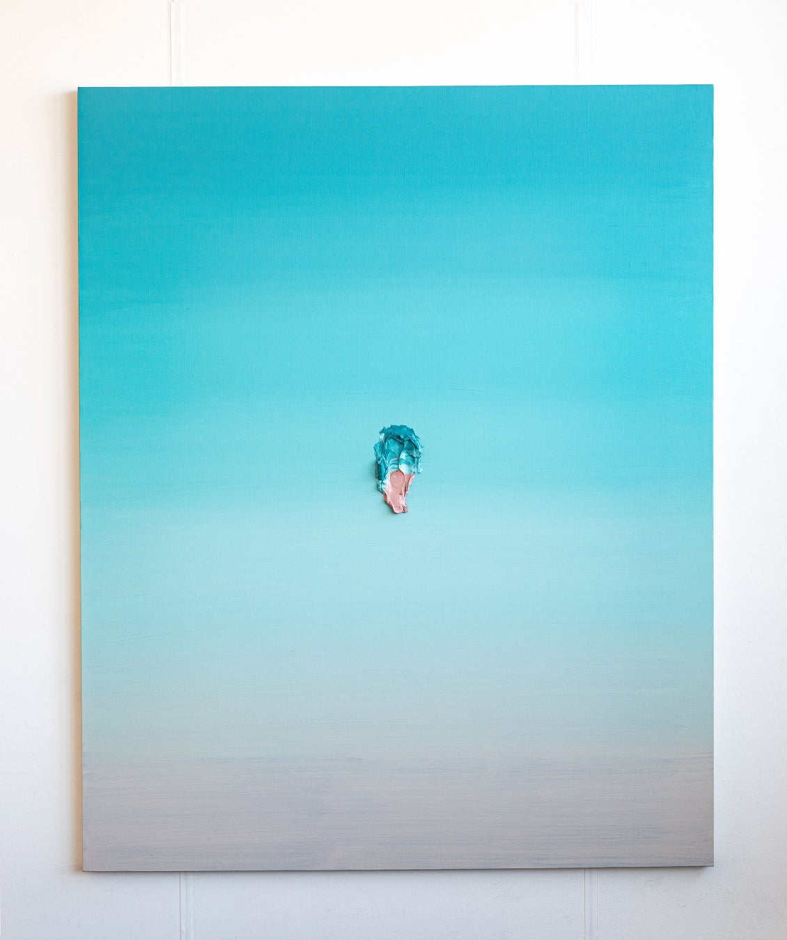 現在は、今までの表現と並行して具体的なイメージを使わない抽象的な色面の制作も行なっています。このシリーズでは、微妙に変化する色面とその色と同じ絵具をつけた様々な物体でデカルコマニーを行う制作で、より絵具の物質性に着目しています。自身の制作意図にも関わらず、最終的にはデカルコマニーで発生する絵具や描画材の組み合わせによる自然現象で絵が完成されてしまう不条理さのようなものに作家は惹かれています。