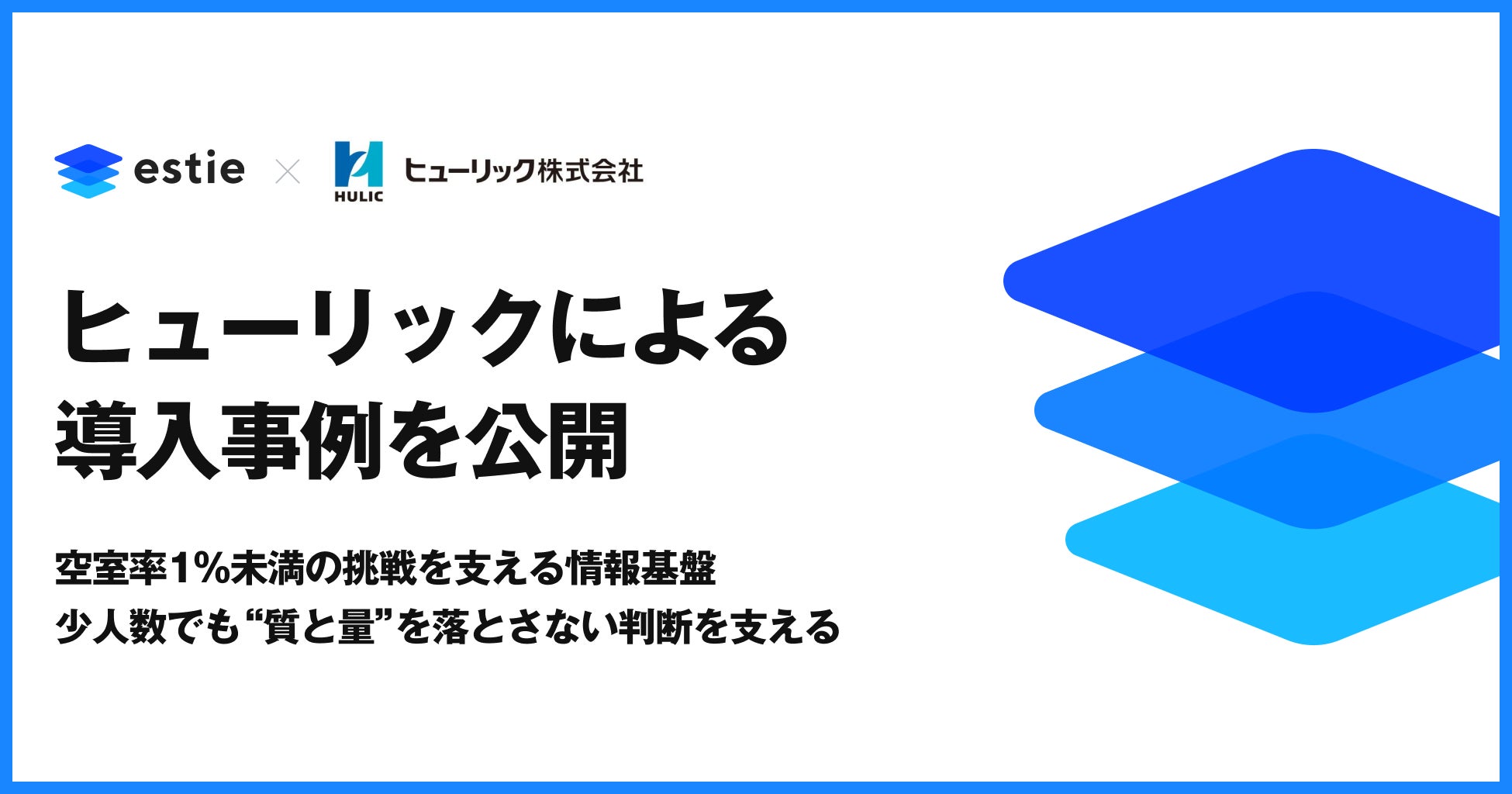 日本最大級の商業用不動産データ分析基盤「estie マーケット調査」を中心に複数のサービスを提供する株式会社estie(本社:東京都港区、代表取締役:平井 瑛、以下「estie」)は、「estie マーケット調査」をご導入いただいたヒューリック株式会社様の事例インタビュー「空室率1%未満の挑戦を支える情報基盤 ─ 少人数でも“質と量”を落とさない判断を支えるestie」を公開しました。