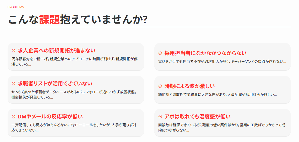 本無料相談では、人材業界の営業活動に関する以下のようなテーマについて相談が可能です。