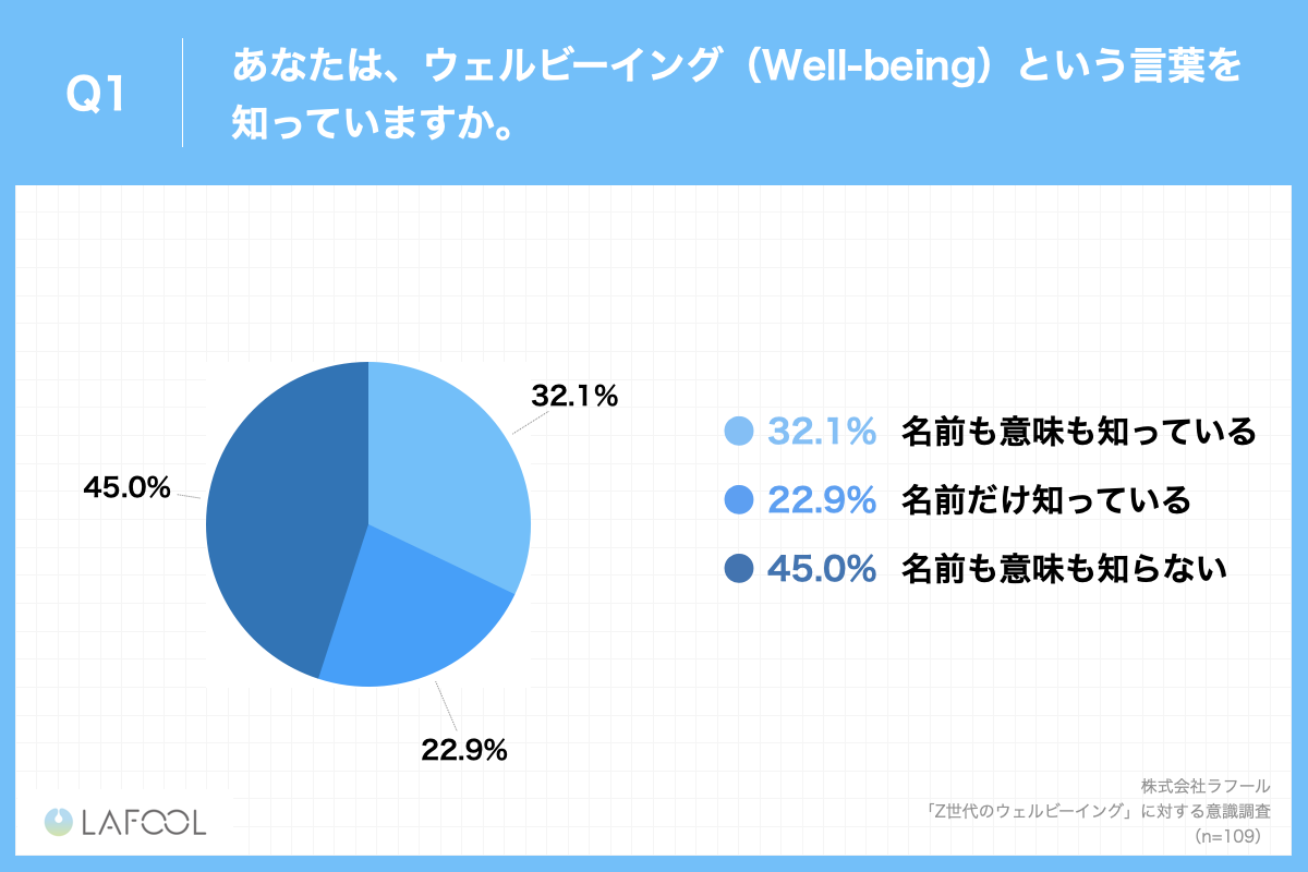 「Q1.あなたは、ウェルビーイング(Well-being)という言葉を知っていますか。」(n=109)と質問したところ、「名前も意味も知っている」が32.1%、「名前だけ知っている」が22.9%という回答となりました。