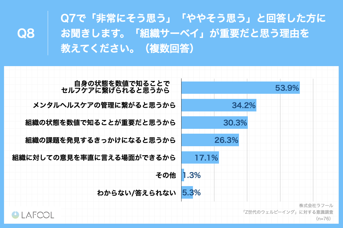 Q7で「非常にそう思う」「ややそう思う」と回答した方に、「Q8.「組織サーベイ」が重要だと思う理由を教えてください。(複数回答)」(n=76)と質問したところ、「自身の状態を数値で知ることでセルフケアに繋げられると思うから」が53.9%、「メンタルヘルスケアの管理に繋がると思うから」が34.2%、「組織の状態を数値で知ることが重要だと思うから」が30.3%という回答となりました。