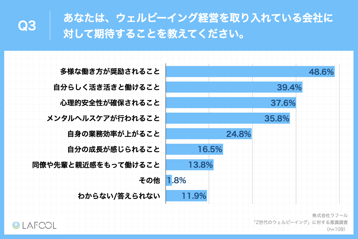 「Q3.あなたは、ウェルビーイング経営を取り入れている会社に対して期待することを教えてください。」(n=109)と質問したところ、「多様な働き方が奨励されること」が48.6%、「自分らしく活き活きと働けること」が39.4%、次いで「心理的安全性が確保されること」が37.6%、「メンタルヘルスケアが行われること」が35.8%という回答となりました。