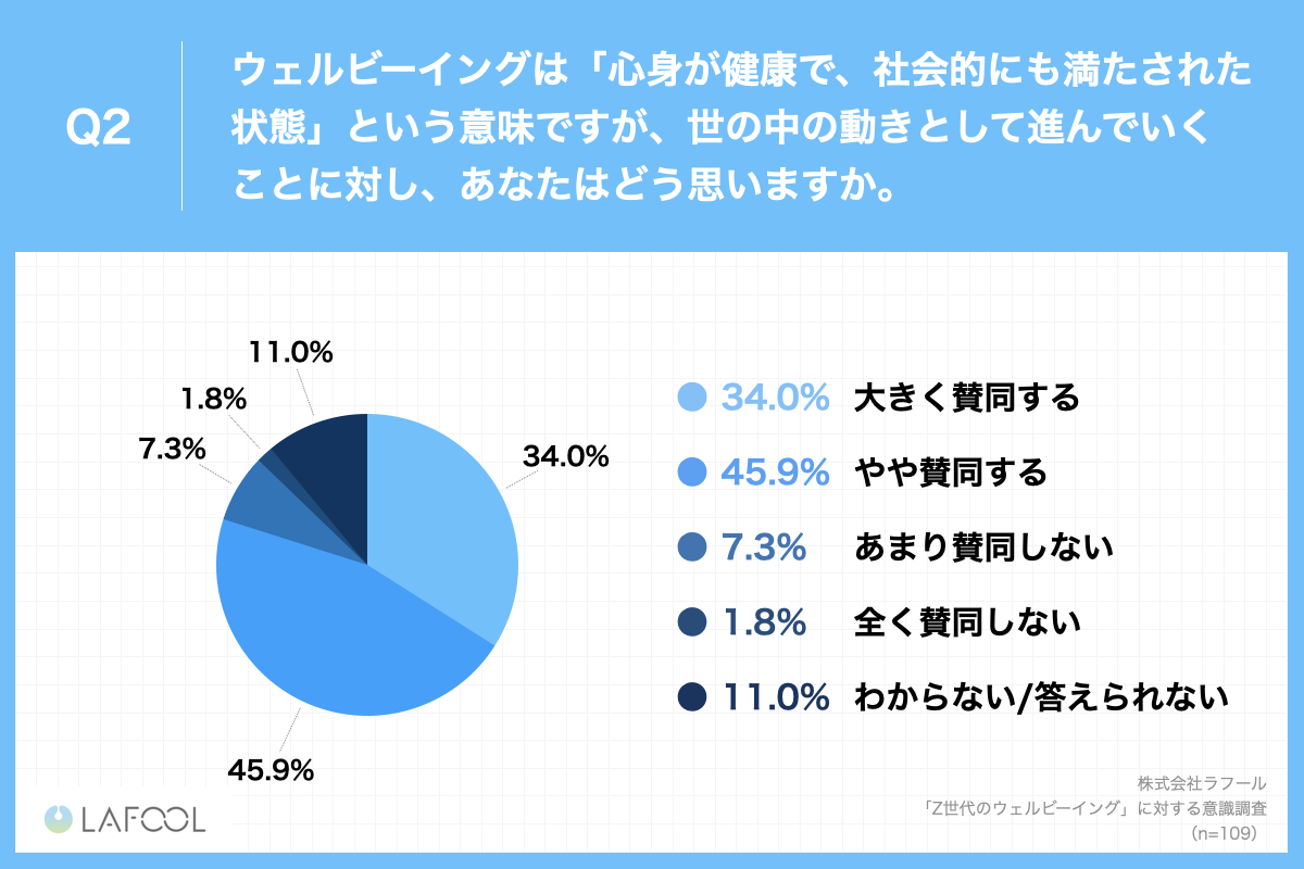 「Q2.ウェルビーイングは「心身が健康で、社会的にも満たされた状態」という意味ですが、世の中の動きとして進んでいくことに対し、あなたはどう思いますか。」(n=109)と質問したところ、「大きく賛同する」が34.0%、「やや賛同する」が45.9%という回答となりました。