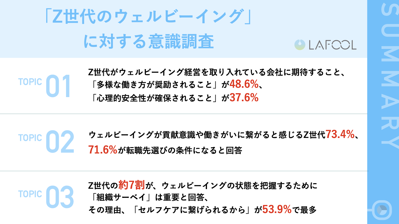 「個人が変われば、 組織が変わる」組織改善サーベイ『ラフールサーベイ』を提供するメンタルデータテックの株式会社ラフール(本社:東京都中央区、代表取締役社⻑:結木啓太、代表取締役副社長:小梨明人、以下「ラフール」)は、従業員数1,000名以上の企業で勤めるZ世代109名に対し、「Z世代のウェルビーイング」に対する意識調査を実施いたしましたので、お知らせいたします。