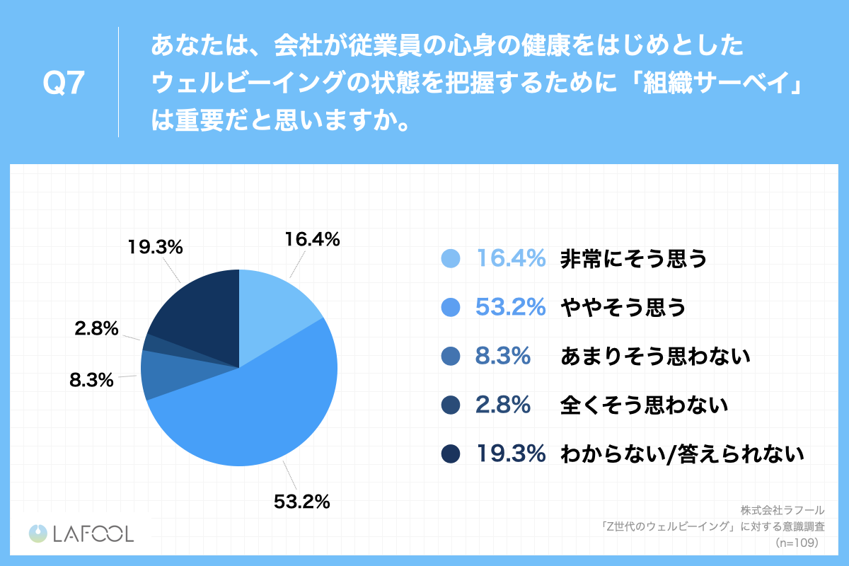 「Q7.あなたは、会社が従業員の心身の健康をはじめとしたウェルビーイングの状態を把握するために「組織サーベイ」は重要だと思いますか。」(n=109)と質問したところ、重要だと思うという回答が69.2%となりました。