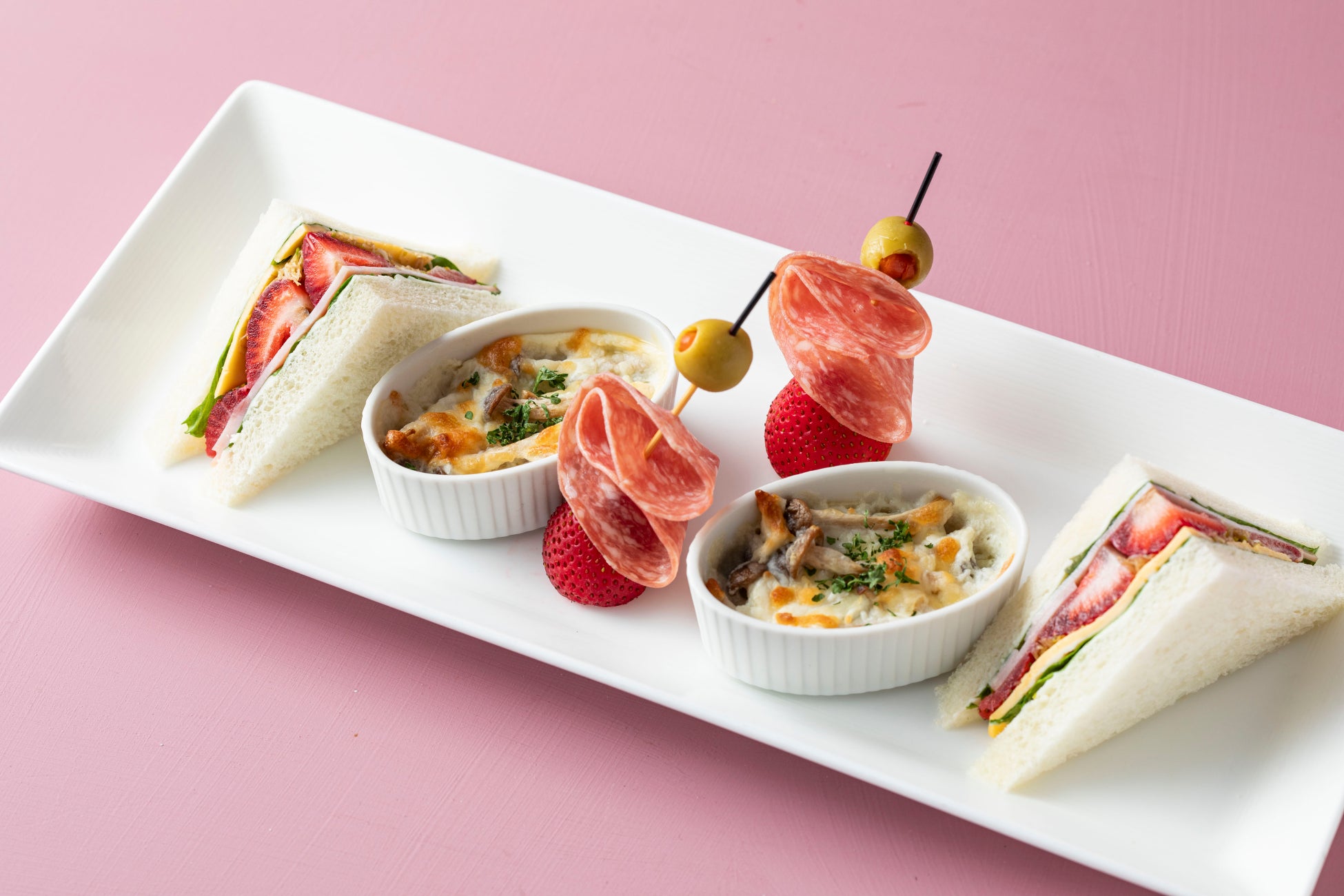 中段には、想像以上にハムとの相性が良い“苺のサンドウィッチ”など3種類のセイボリーを。