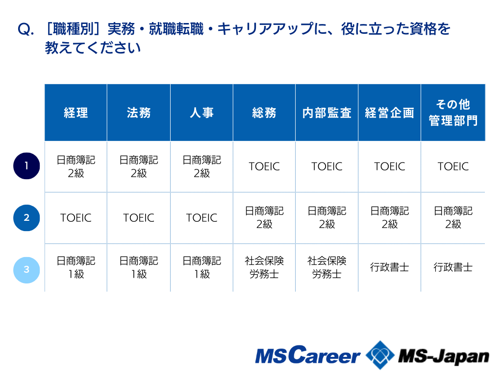 3. キャリアアップに役立った資格は、管理部門のどの職種でも「簿記2級」がTOP3にランクイン