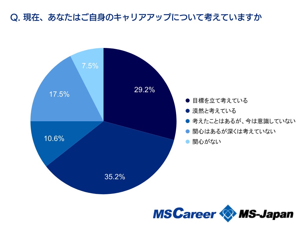 今回の調査では、「現在、あなたはご自身のキャリアアップについて考えていますか」という設問に対し、目標を立て考えているが29.2%、漠然と考えているが35.2%で、全体の6割を超える64.4%が「考えている」という結果となりました。