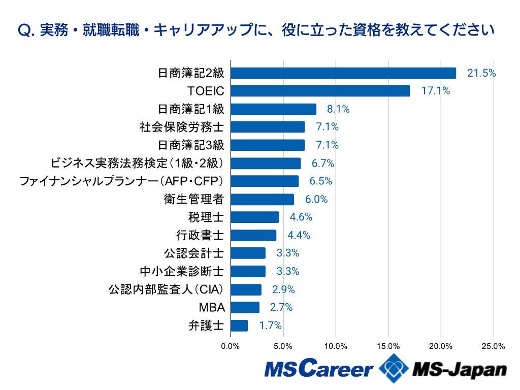 管理部門がキャリアアップに役立った資格に関する設問では、回答数が多い順に、「日商簿記2級」21.5%、「TOEIC」17.1%、「日商簿記1級」8.1%と続きました。