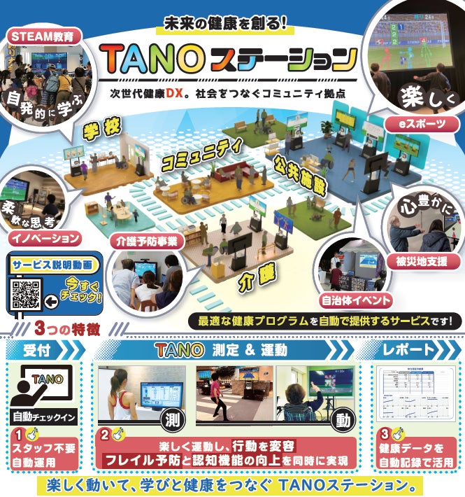 TANOステーションは、TANOを活用した先進的な運動・健康支援システムで、地域や施設における健康づくりやフレイル・認知症予防をサポートする仕組みです。
