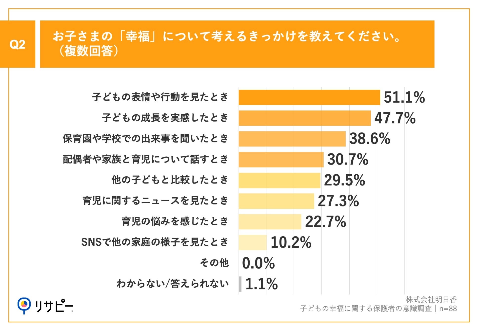 Q1で「よく考える」「たまに考える」と回答した方に、「Q2.お子さまの『幸福』について考えるきっかけを教えてください。(複数回答)」(n=88)と質問したところ、「子どもの表情や行動を見たとき」が51.1%、「子どもの成長を実感したとき」が47.7%、「保育園や学校での出来事を聞いたとき」が38.6%という回答となりました。