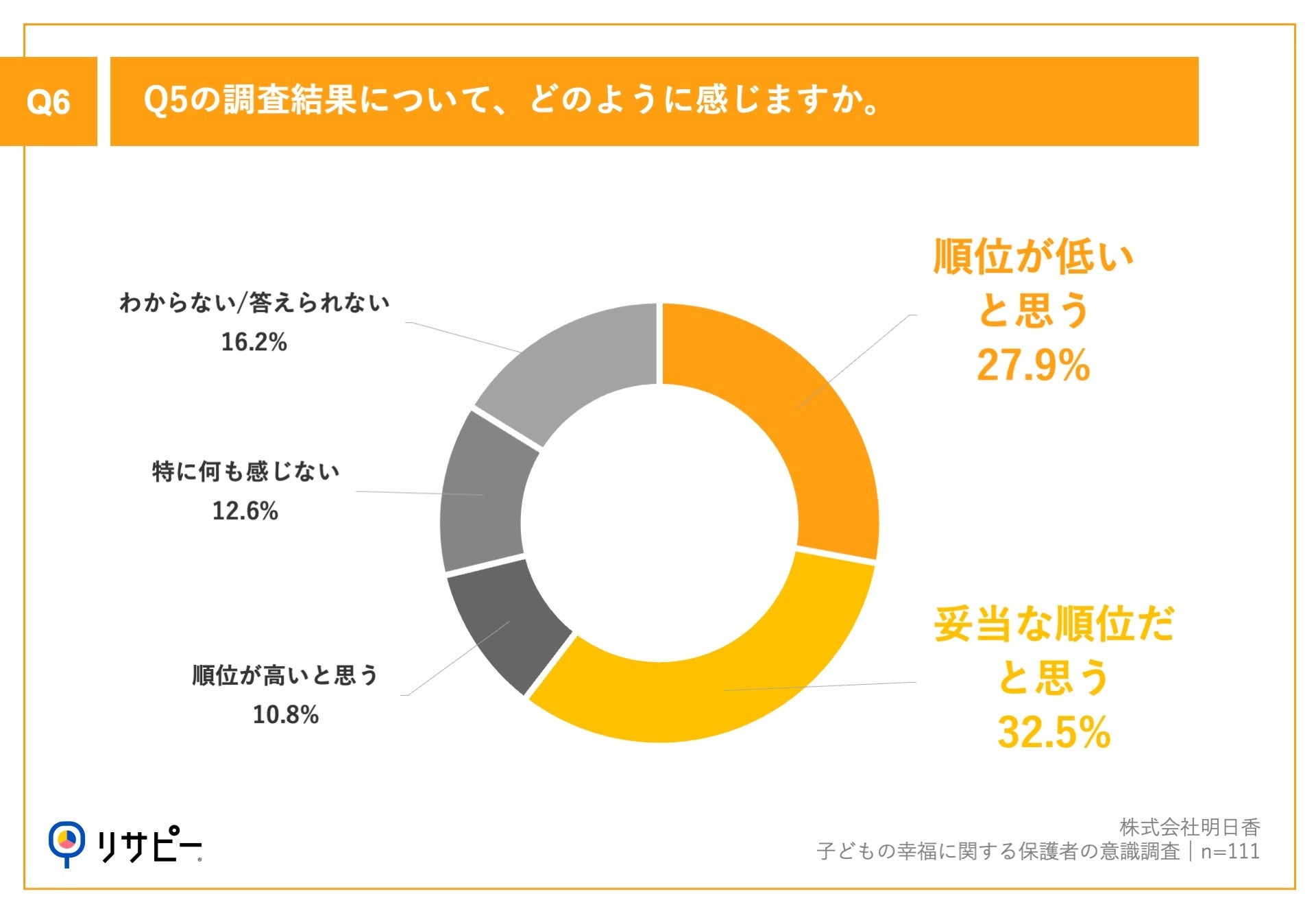 「Q6.Q5の調査結果について、どのように感じますか。」(n=111)と質問したところ、「順位が低いと思う」が27.9%、「妥当な順位だと思う」が32.5%という回答となりました。