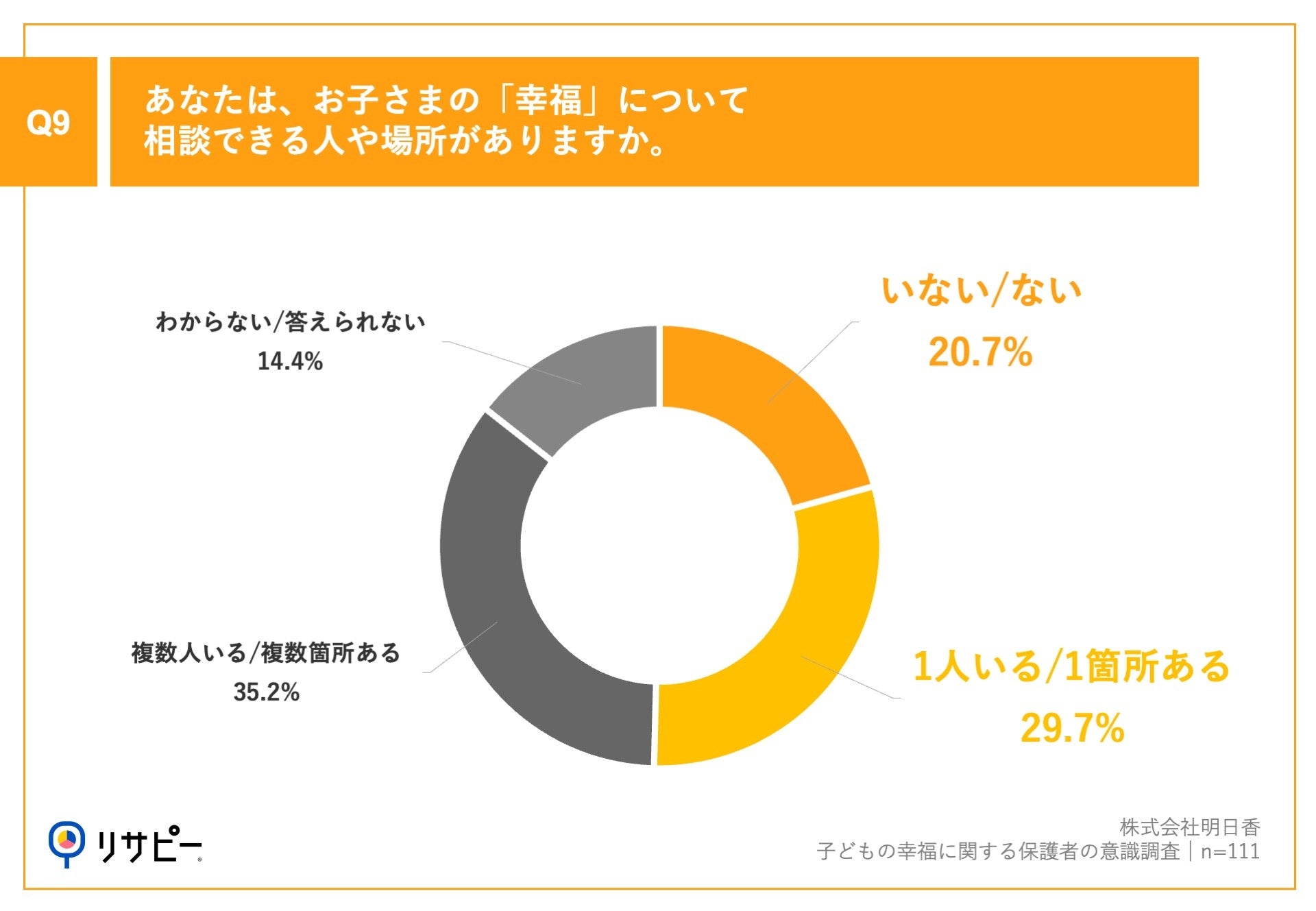 「Q9.あなたは、お子さまの『幸福』について相談できる人や場所がありますか。」(n=111)と質問したところ、「いない/ない」が20.7%、「1人いる/1箇所ある」が29.7%、「複数人いる/複数箇所ある」が35.2%という回答となりました。