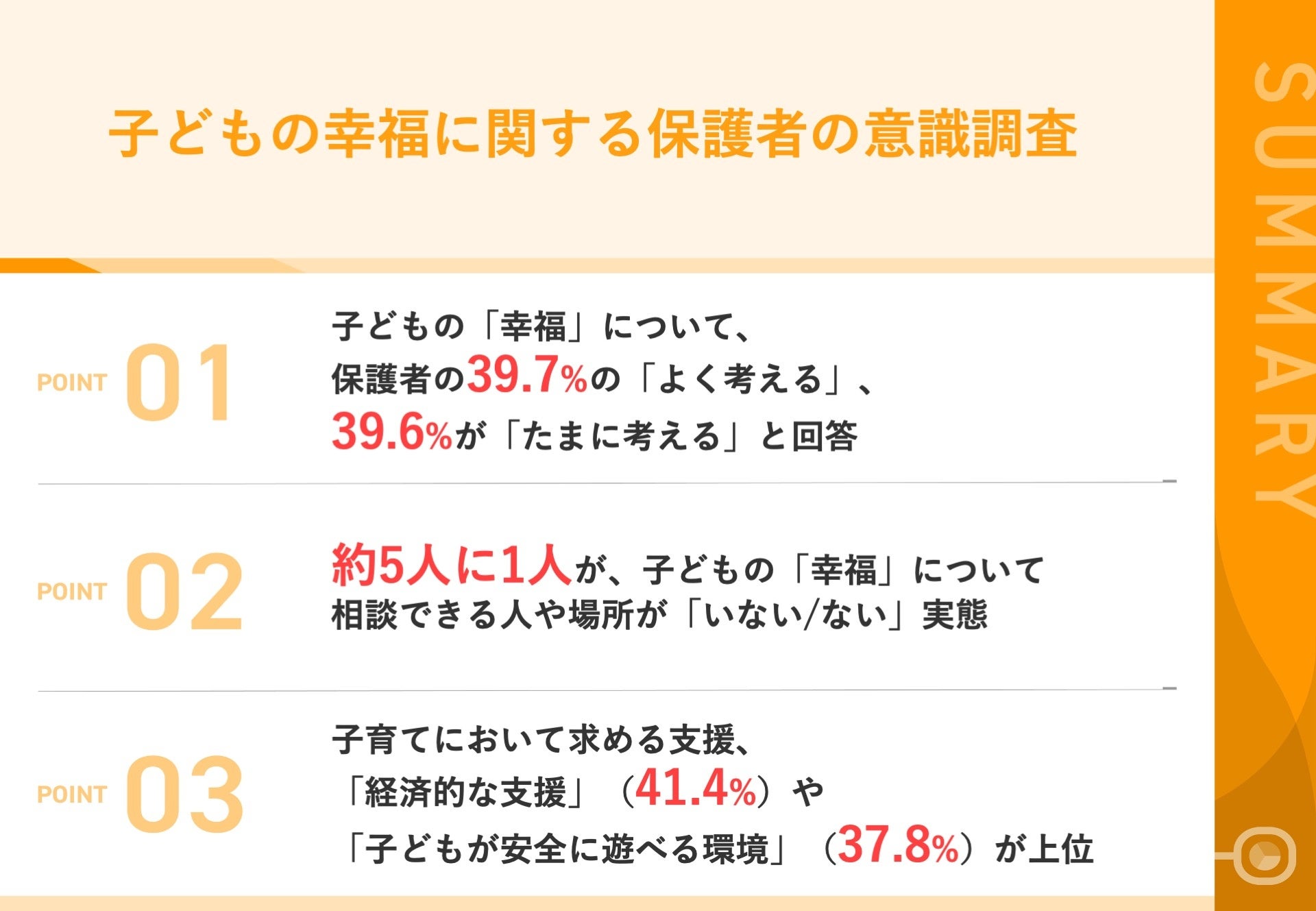 まず、子どもの「幸福」について、保護者の39.7%の「よく考える」、39.6%が「たまに考える」と回答しており、子どもの幸福について日常的に考えている保護者は約4割にとどまることがわかりました。また、子どもの「幸福」において重要な要素では、「精神的な健康・心の安定」(68.5%)や「家族からの愛情」(62.2%)が挙げられています。一方で、「日本の子どもの幸福度は先進36カ国中14位」というユニセフの調査結果(※2)について、「今回初めて知った」保護者が63.1%にのぼり、調査結果に対する評価としては、「順位が低い」が27.9%、「妥当な順位」が32.5%でした。さらに、約5人に1人(20.7%)が、子どもの「幸福」について相談できる人や場所が「いない/ない」と回答し、子育てにおいて求める支援では、「経済的な支援」(41.4%)や「子どもが安全に遊べる環境」(37.8%)が上位となっています。