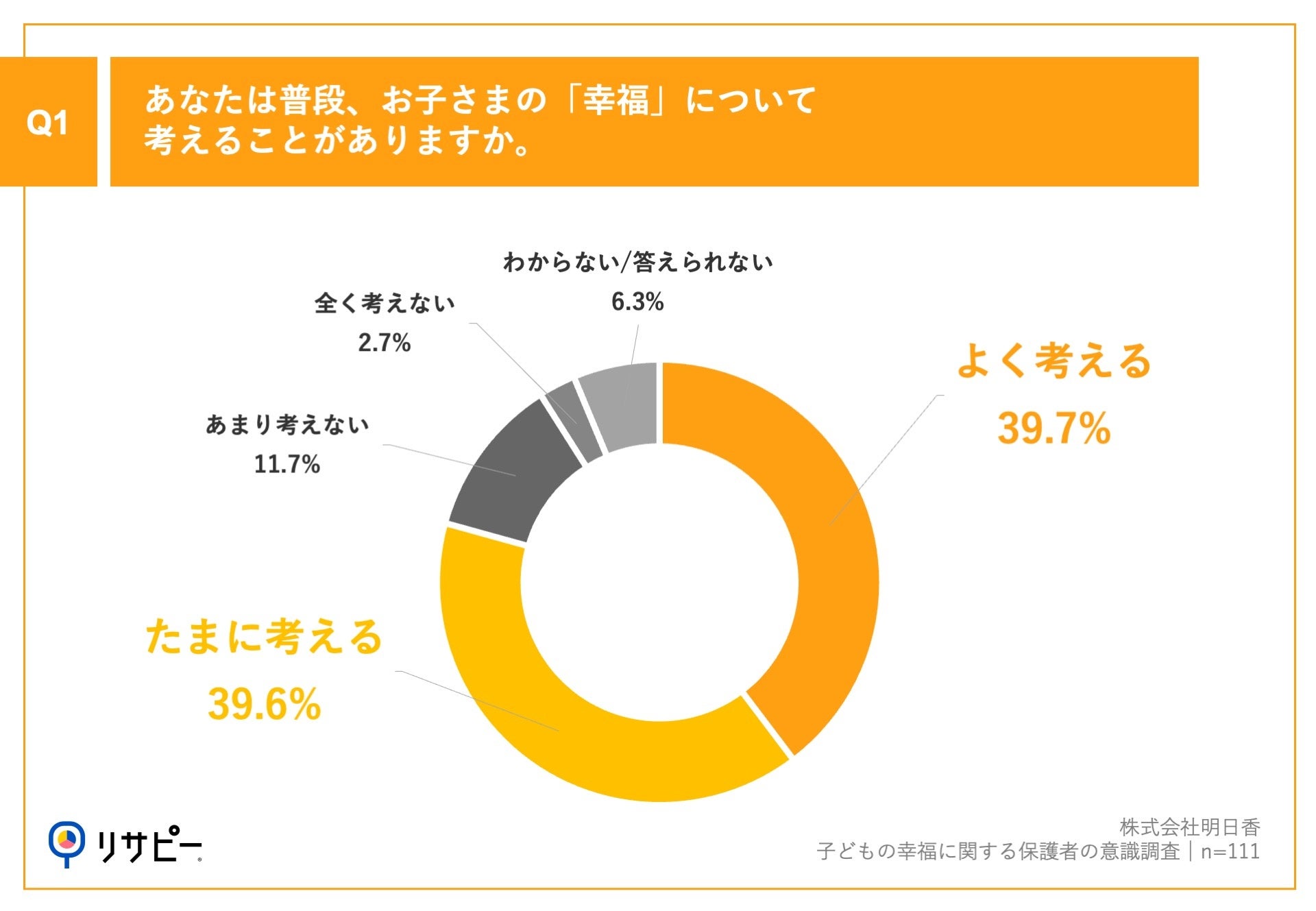 「Q1.あなたは普段、お子さまの『幸福』について考えることがありますか。」(n=111)と質問したところ、「よく考える」が39.7%、「たまに考える」が39.6%という回答となりました。