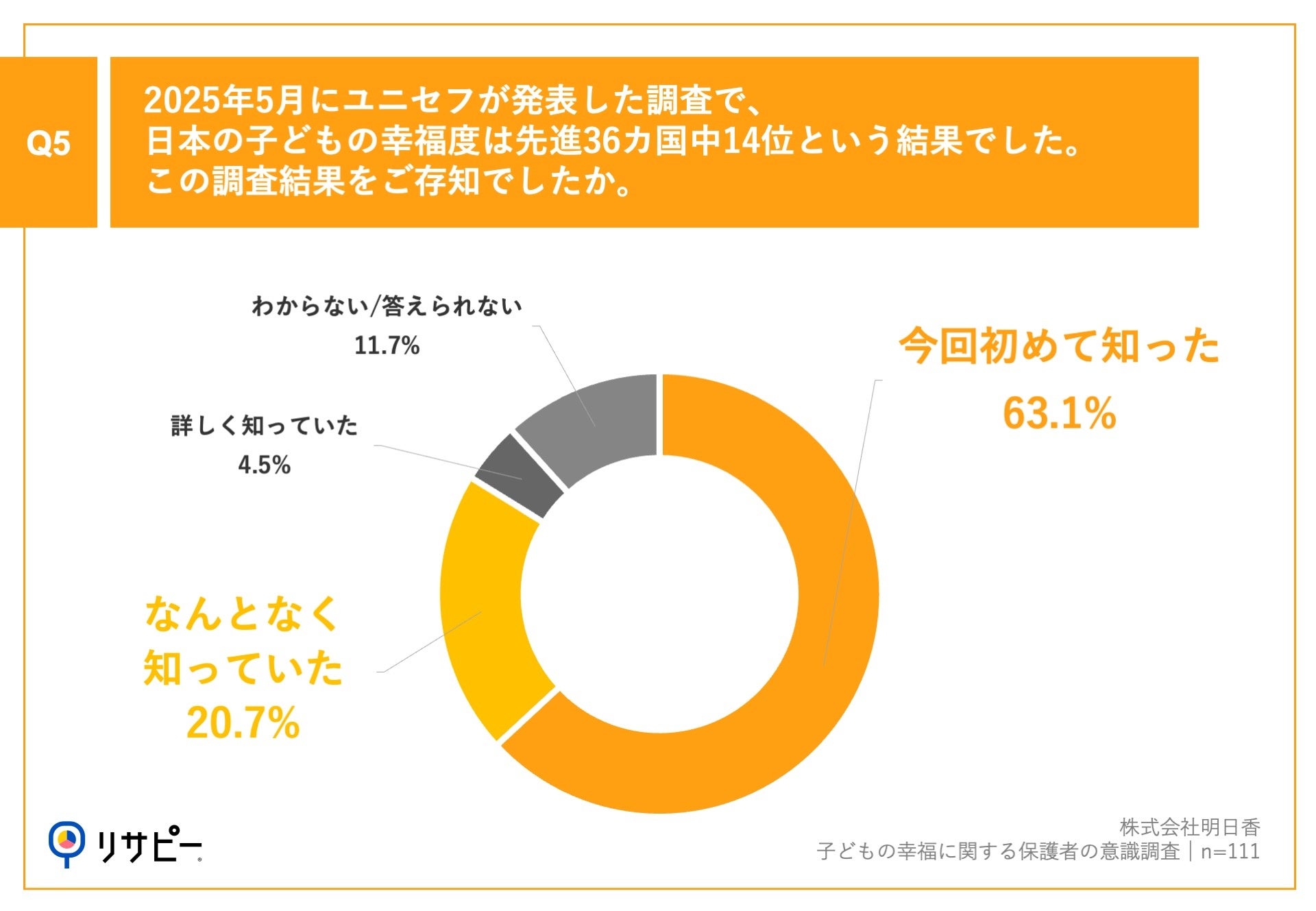 「Q5.2025年5月にユニセフが発表した調査(※2)で、日本の子どもの幸福度は先進36カ国中14位という結果でした。この調査結果をご存知でしたか。」(n=111)と質問したところ、「今回初めて知った」が63.1%、「なんとなく知っていた」が20.7%という回答となりました。