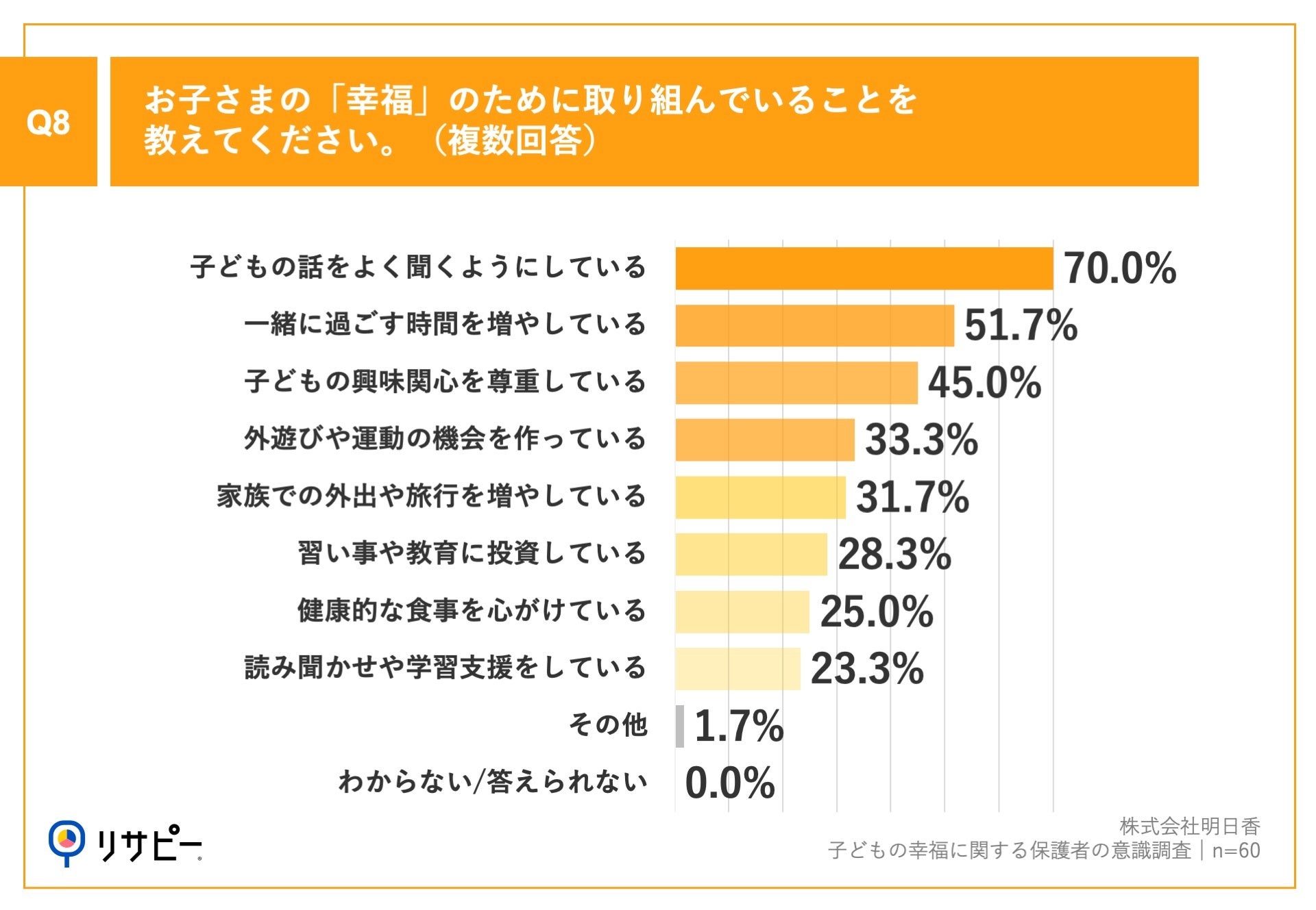 Q7で「積極的に取り組んでいる」「少し取り組んでいる」と回答した方に、「Q8.お子さまの『幸福』のために取り組んでいることを教えてください。(複数回答)」(n=60)と質問したところ、「子どもの話をよく聞くようにしている」が70.0%、「一緒に過ごす時間を増やしている」が51.7%、「子どもの興味関心を尊重している」が45.0%という回答となりました。