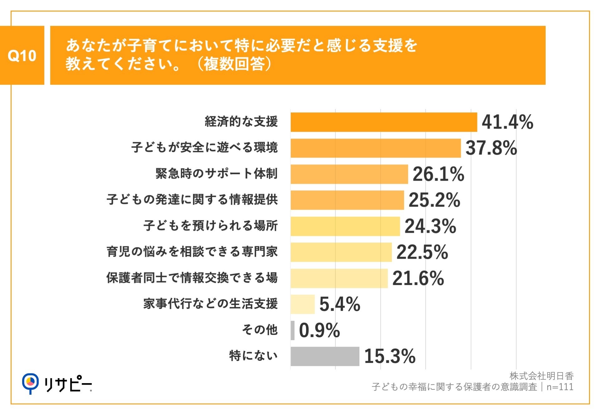 「Q10.あなたが子育てにおいて特に必要だと感じる支援を教えてください。(複数回答)」(n=111)と質問したところ、「経済的な支援」が41.4%、「子どもが安全に遊べる環境」が37.8%、「緊急時のサポート体制」が26.1%という回答となりました。