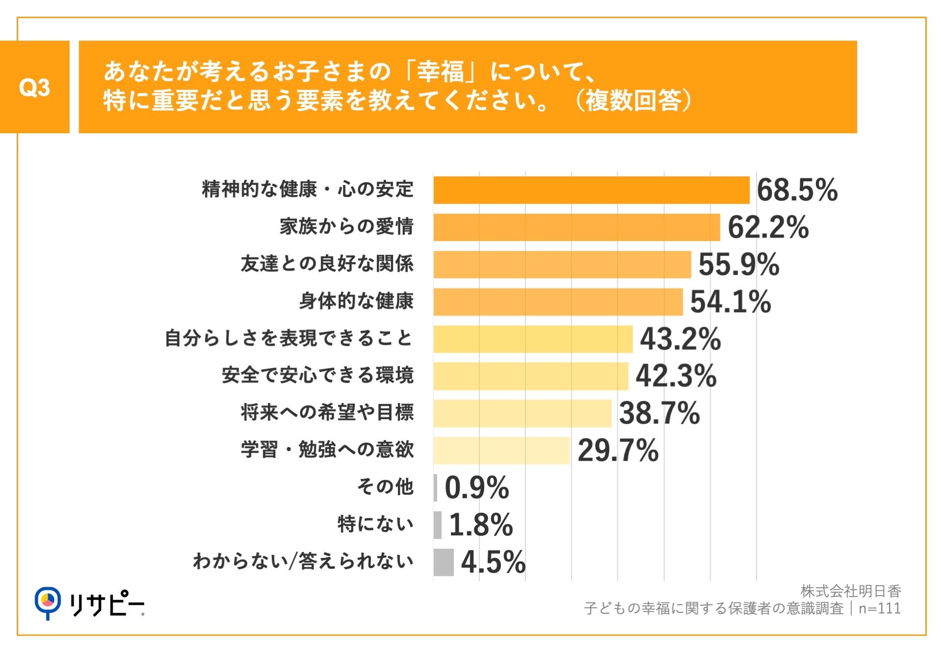 「Q3.あなたが考えるお子さまの『幸福』について、特に重要だと思う要素を教えてください。(複数回答)」(n=111)と質問したところ、「精神的な健康・心の安定」が68.5%、「家族からの愛情」が62.2%、「友達との良好な関係」が55.9%という回答となりました。