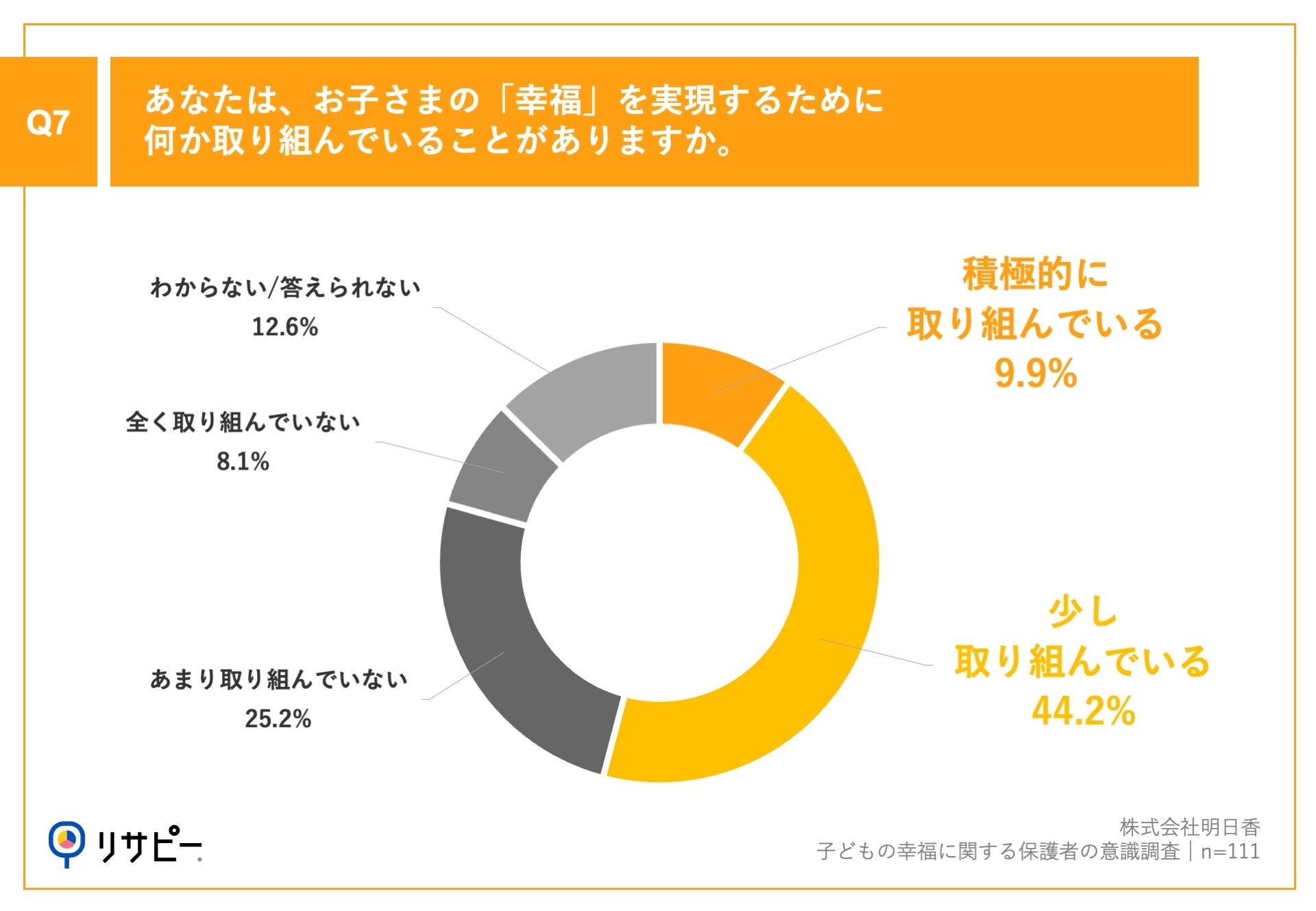 「Q7.あなたは、お子さまの『幸福』を実現するために何か取り組んでいることがありますか。」(n=111)と質問したところ、「積極的に取り組んでいる」が9.9%、「少し取り組んでいる」が44.2%という回答となりました。